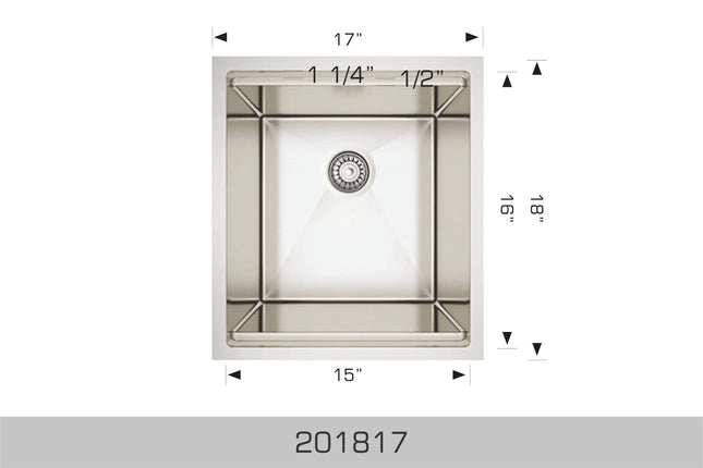 Bosco Commercial Series 23″ x 18″ Single Bowl Kitchen Sink Radius Corner 203339C Radius Corner Rear positioned drain holes to maximize usable bowl and cabinet storage space below Specifications Handcrafted 304 stainless steel 16 gauge 18/10 chrome nickel content Bowl corner radius of 15mm Brushed finish Undermount clips Template Stainless steel strainer 10″ Deep Dimensions Outside: 23″ x 18″ x 10″ Inside: 21″ x 16″ x 10″ Minimum cabinet size 26″