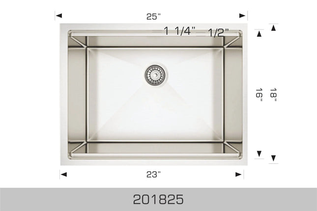 Radius Corner Rear positioned drain holes to maximize usable bowl and cabinet storage space below Specifications Handcrafted 304 stainless steel 18 gauge 18/10 chrome nickel content Brushed finishing Bowl corner radius of 15mm Undermount clips Template Stainless steel strainer Dimensions Outside: 23″ x 18″ x 5 1/2″ Inside: 21″ x 16″ x 5 1/2″ Minimum cabinet size 26″ 5 1/2″ Deep