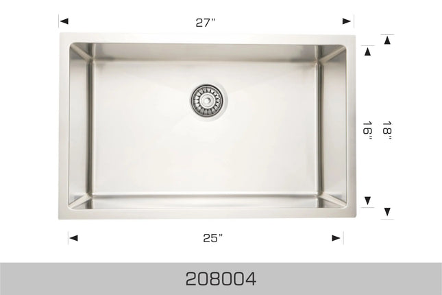 Radius Corner Rear positioned drain holes to maximize usable bowl and cabinet storage space below Specifications Handcrafted 316 stainless steel 16 gauge 18/10 chrome nickel content Bowl corner radius of 15mm Brushed finish Undermount Clips Template Stainless steel strainer Top to lip 1 1/4″ lower Lip 1/2 10″ Deep Dimensions Outside: 27″ x 18″ x 10″ Inside: 25″ x 16″ x 10″ Minimum cabinet size: 30″ Specification Sheet and Template PDF Specification Sheet DXF Template