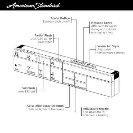 - Deodorizer: Air Shield, Room Refresh and Blue Light technology cleans the air in and around the bowl