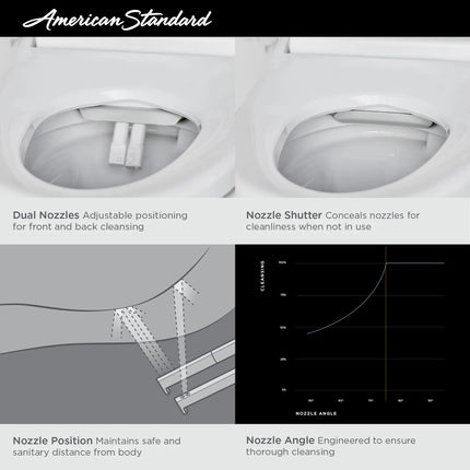 The Advanced Clean 100 SpaLet Bidet Toilet from American Standard combines the cleansing of a bidet with the sleek lines of a modern, auto-flush toilet. Featuring a heated bidet seat with dual nozzles that direct a soothing stream of warm water to both front and rear areas, it ensures a complete, comfortable cleansing experience. Beneficial for expectant and new moms, offering relief from uncomfortable conditions that come with pregnancy and postpartum. Engineered for unparalleled personal hygiene and design excellence, the Advanced Clean 100 SpaLet Bidet Toilet delivers a uniquely refreshing experience in a style to complement every bathroom.