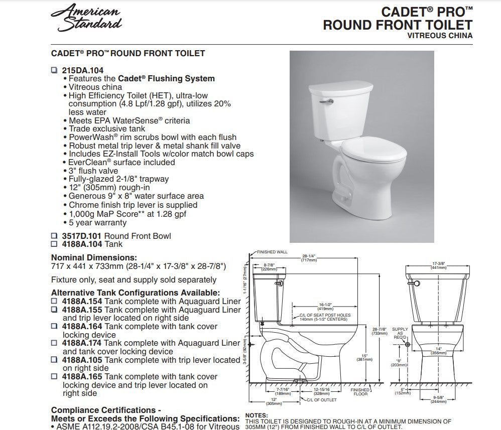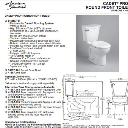 The Cadet Standard-Height Round-Front Toilet from American Standard is plumber tested and plumber approved. The Cadet is backed by an industry-leading warranty that includes lifetime on chinaware, 5 years on mechanical parts, and 1 year on the seat. Engineered for high-efficiency, low consumption, it uses 1.28 gallons per flush, 20% less water than a regular toilet, and is WaterSense certified, your assurance of optimal water savings, quality and performance. The EverClean surface inhibits the growth of stain and odor-causing bacteria, mold and mildew. This round-front toilet is the ideal option when space is limited as it accommodates smaller bathrooms perfectly.