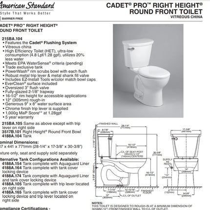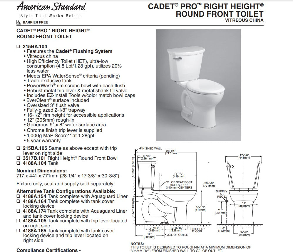 The Cadet PRO Right Height toilet from American Standard is an ADA compliant trade exclusive toilet that sits at a comfortable and accessible 16-1/2" tall. The Cadet PRO features the Cadet Flushing System, which performs with excellence and at a great value. An innovative EverClean surface comes standard with the Cadet PRO and inhibits the growth of bacteria, mold, and mildew that case odors and stains, keeping your toilet cleaner, longer. A flow rate of 1.28 gallons per flush uses 20% less water than a standard 1.6 gpf toilet and without sacrificing performance, ensures a powerful flush and superior bowl cleaning.