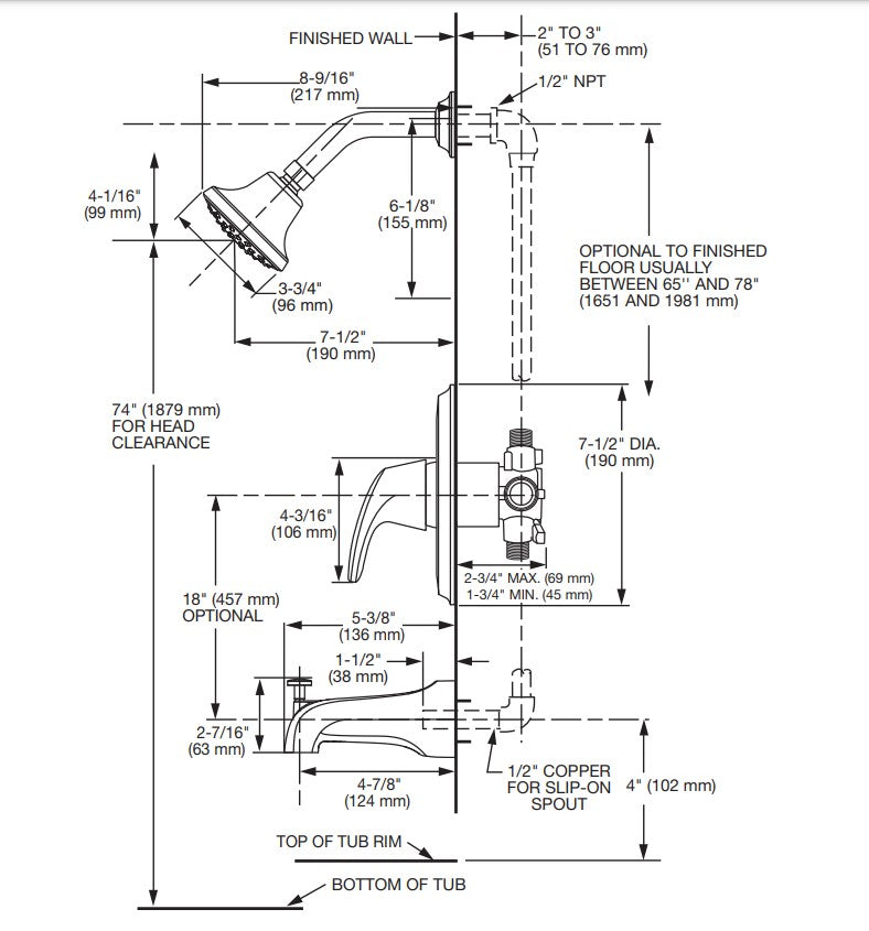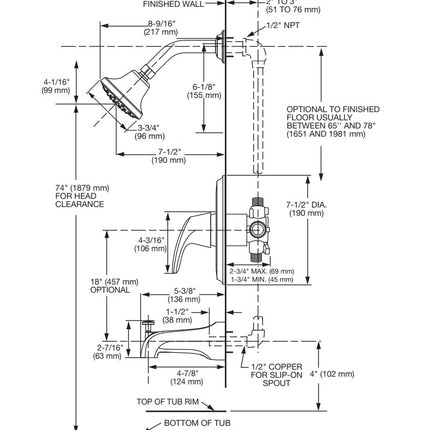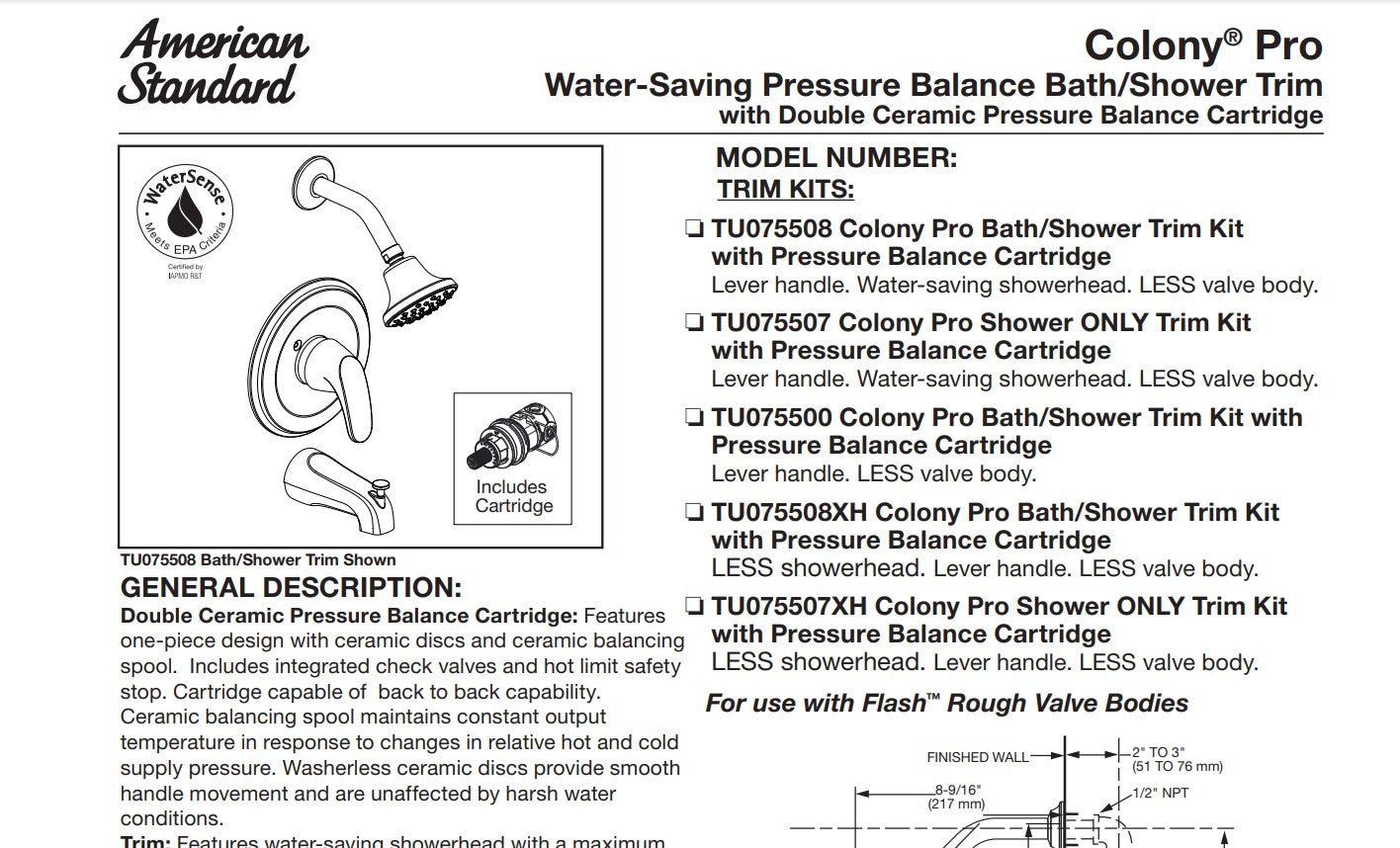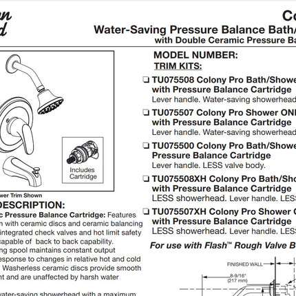 American Standard Colony PRO 1.75 gpm/6.6 L/min Tub and Shower Trim Kit With Water-Saving Showerhead, Double Ceramic Pressure Balance Cartridge With Lever Handle
