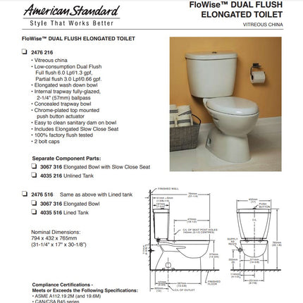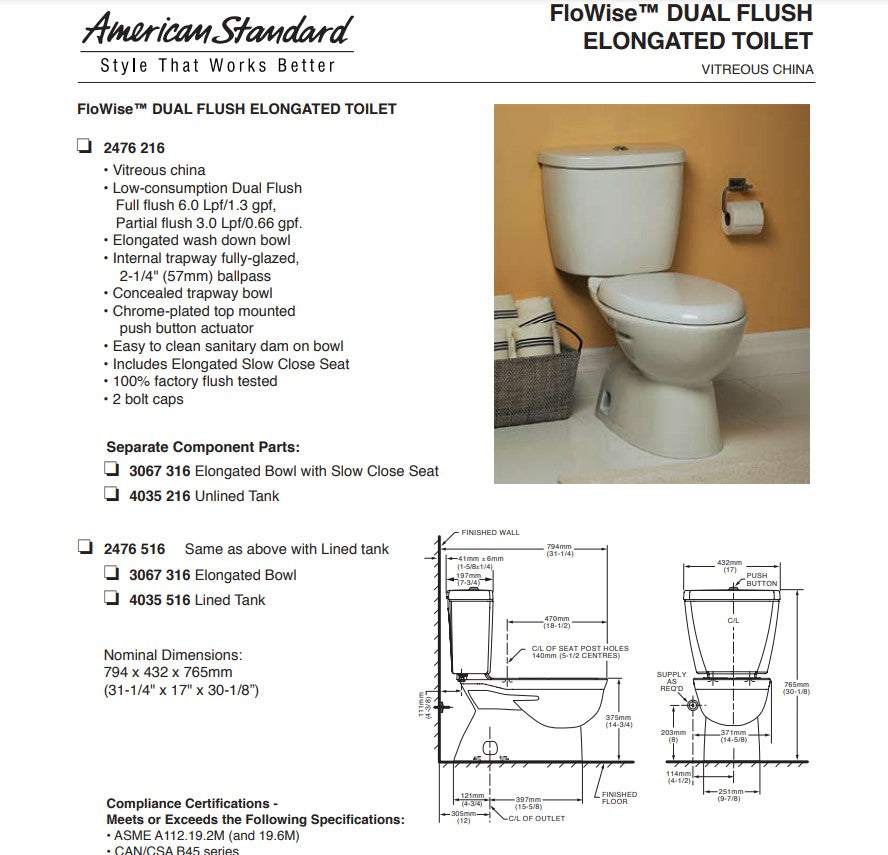 American Standard FloWise 1.6 gpf Elongated Toilet With Seat