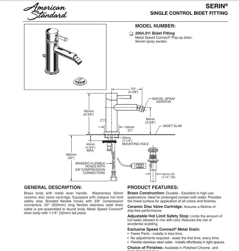 American Standard Serin Single Hole Bidet Faucet Less is more. This bidet faucet from our modern Serin Collection is designed to be more stunning and engineered to be more user-friendly. It's easy to install. The handle has an adjustable hot-limit safety stop to help prevent accidental scalding. And the swivel-spray aerator allows you to direct the over-the-rim spray. Style and substance strike a perfect balance in the bathroom faucet collections from American Standard®. Our faucets are engineered to look beautiful and function flawlessly. Worry-free, drip-free and built to last, all of our bathroom faucets are covered by our Limited Lifetime Warranty on function and finish.