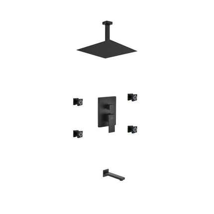 Kube Bath Aqua Piazza Black Shower Set With 12" Ceiling Mount Square Rain Shower, Tub Filler and 4 Body Jets
