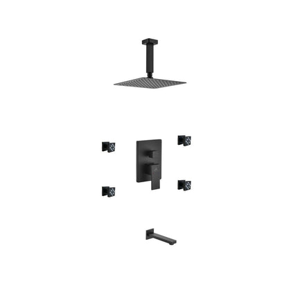 Kube Bath Aqua Piazza Black Shower Set With 8" Ceiling Mount Square Rain Shower, Tub Filler and 4 Body Jets