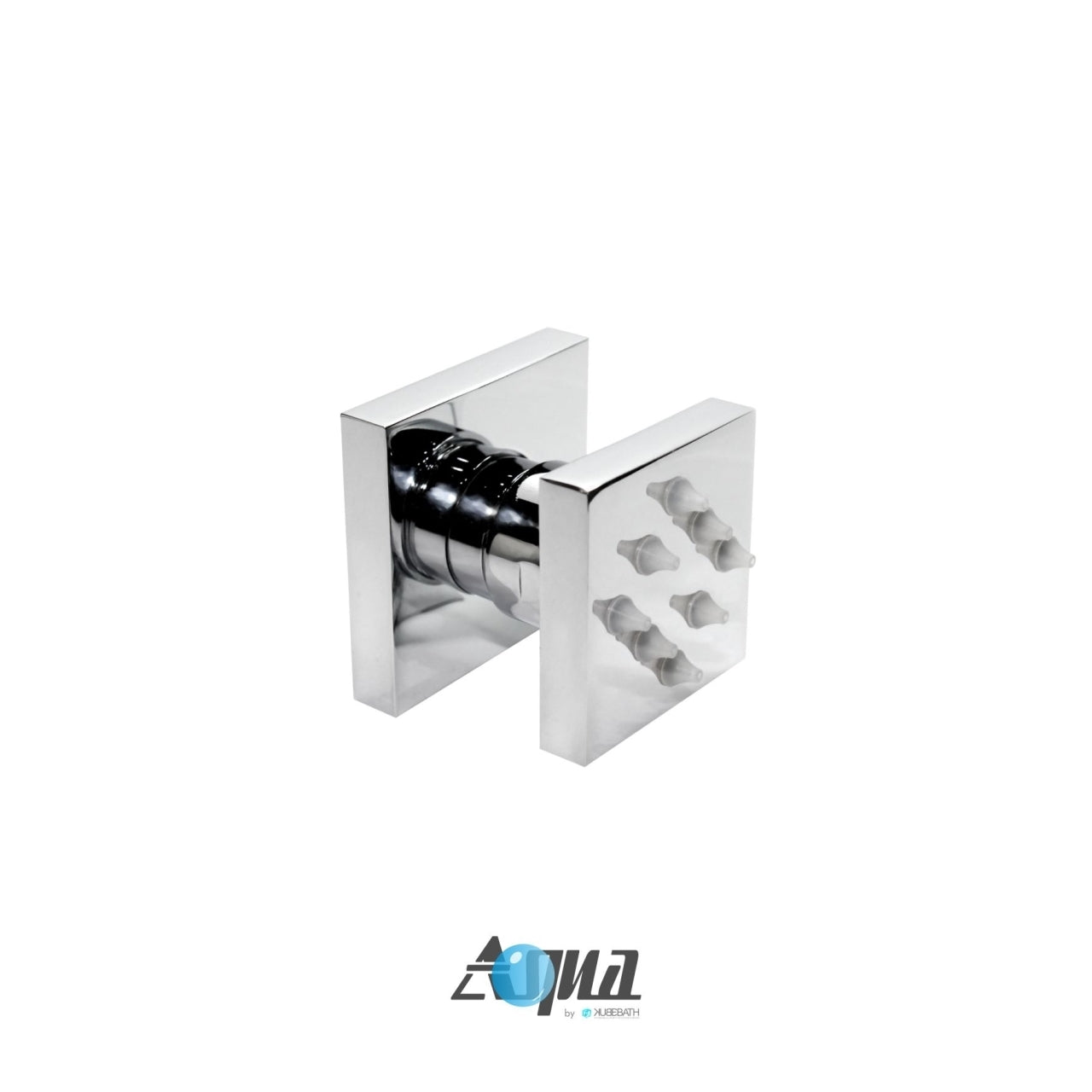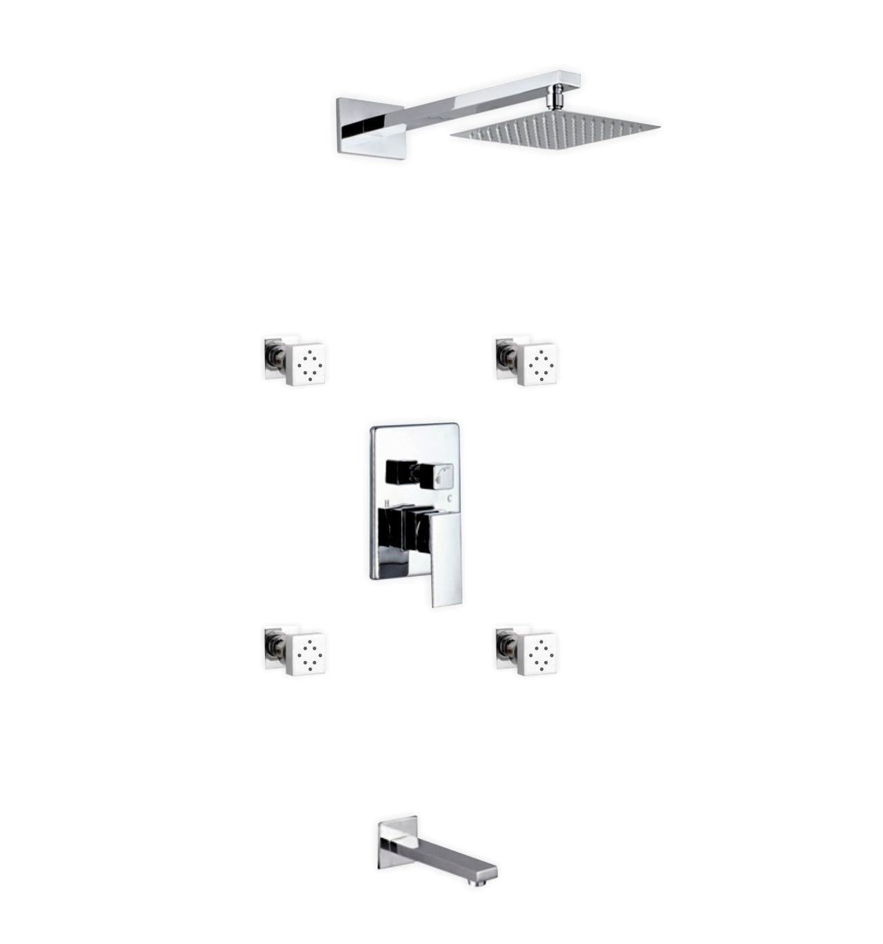 Kube Bath Aqua Piazza Brass Shower Set With 8" Square Rain Shower, 4 Body Jets and Tub Filler Chrome The Aqua Piazza Collection takes pure and simple geometric forms and composes them into an expression of modern luxury. The unapologetic angularity of the faucet is juxtaposed by a flow of water that is surprisingly laminar and gentle. Aqua Piazza is the product of an intimate cooperation between design and German Engineering.