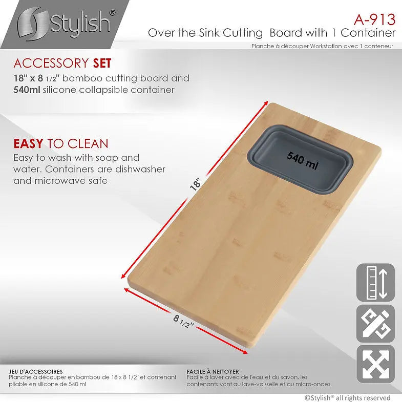 Stylish 18 inch Kitchen Sink Bamboo Cutting Board Set with 1 Collapsible Container