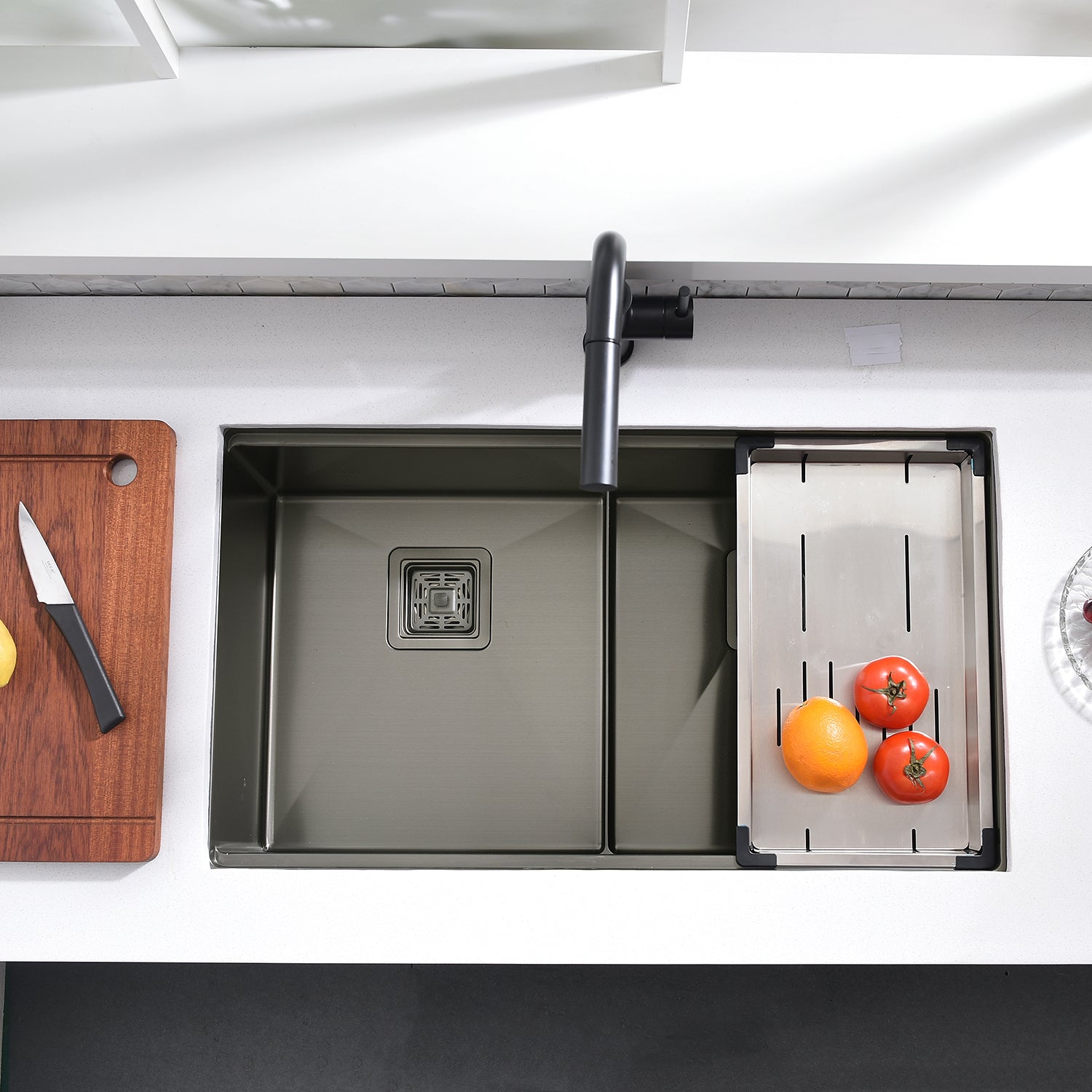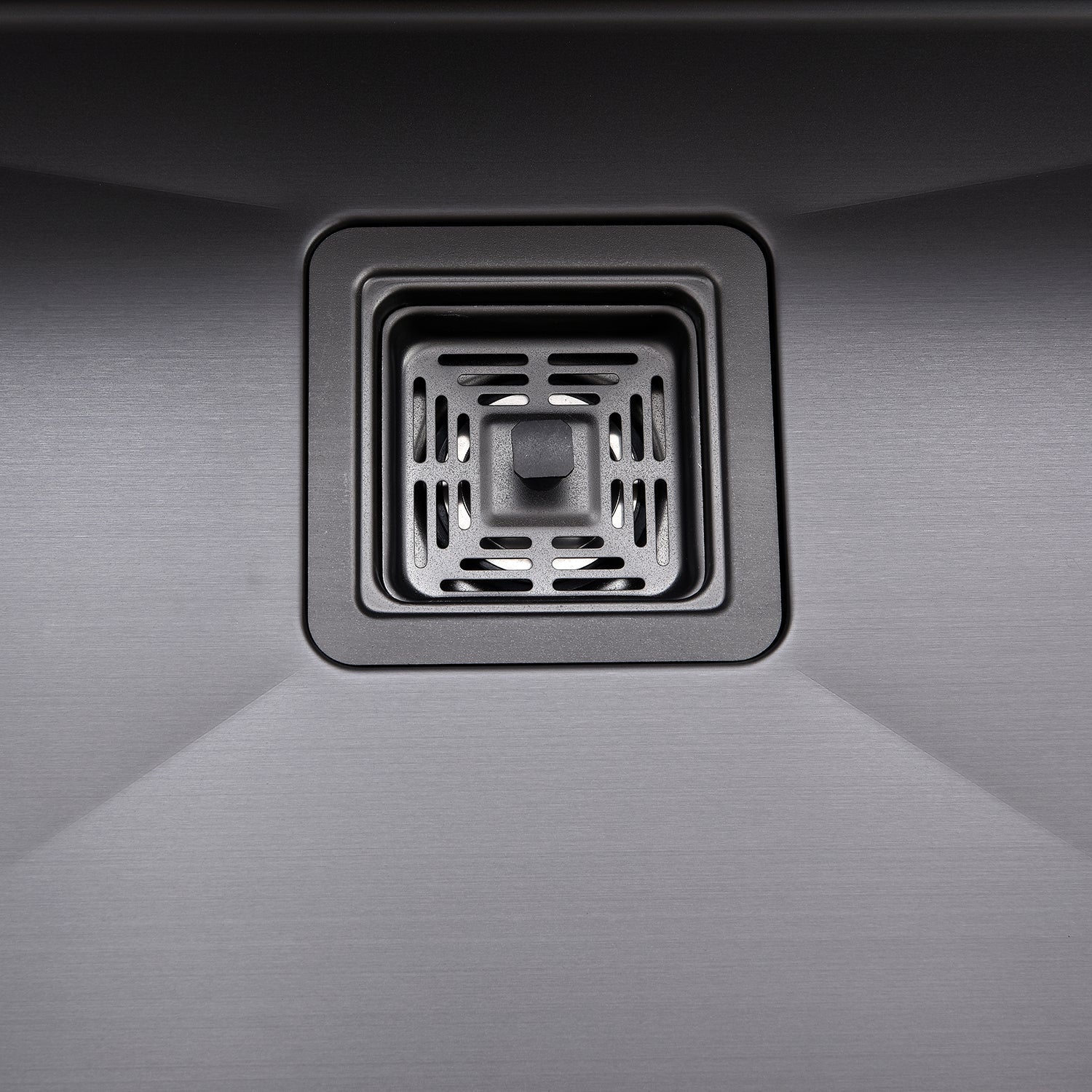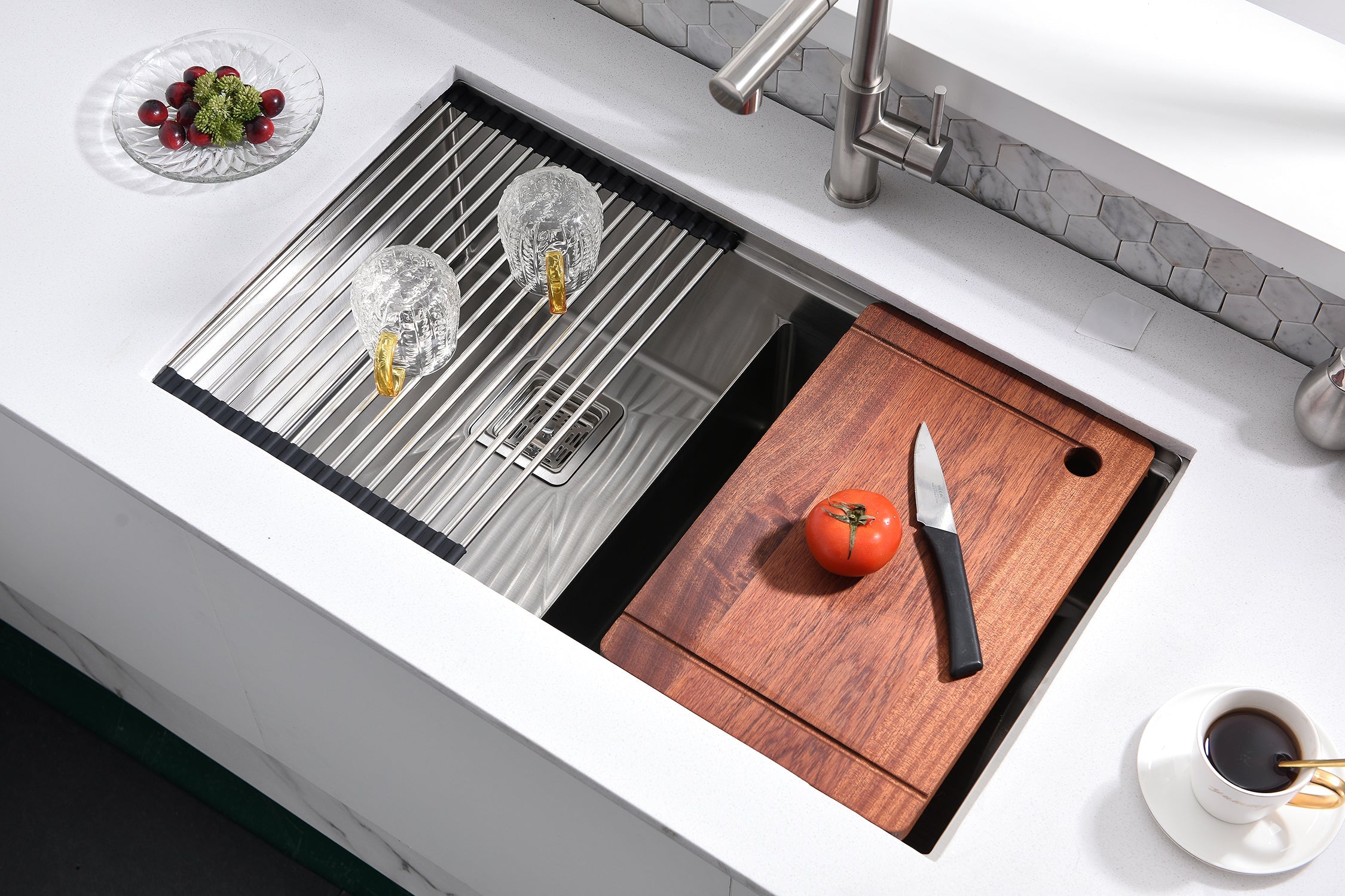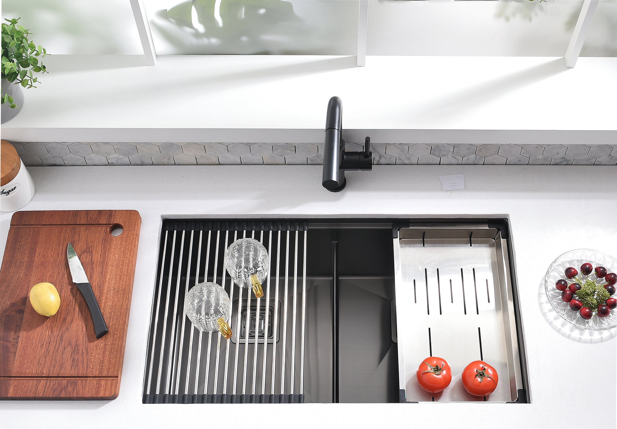 With your purchase, enjoy essential accessories including a bottom grid, square strainer drain, bamboo cutting board, colander, and a convenient roll-up rack. The excellent handcraft, executed by craftsmen with over 10 years of experience, distinguishes this sink from machine-pressed alternatives, ensuring meticulous attention to detail.