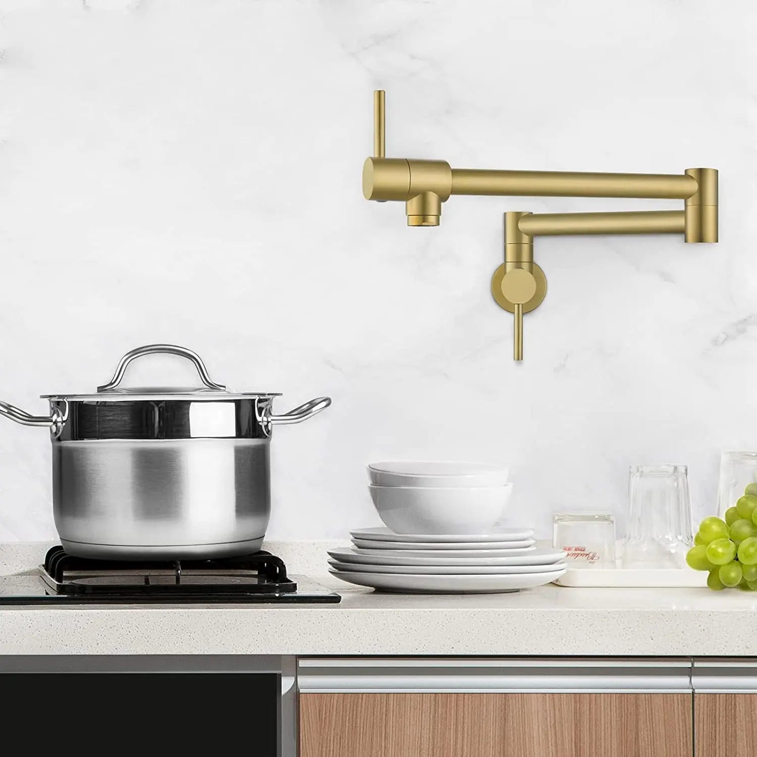 Cleo Elegante Wall Mount Kitchen Pot Filler Upgrade your kitchen with the Cleo Elegante Wall Mount Kitchen Pot Filler, a perfect fusion of form and function. Crafted from solid lead-free brass, this pot filler ensures durability and reliability for your culinary endeavors.