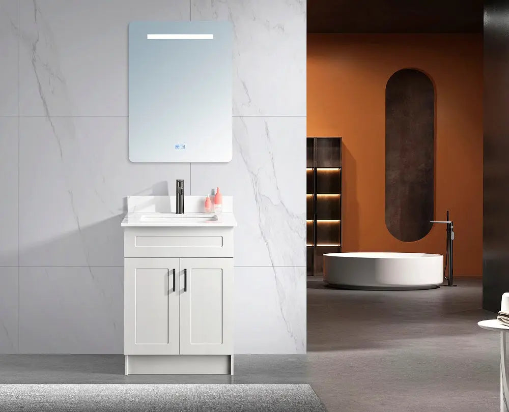 Introducing our meticulously crafted Beveled Edge Shaker-style bathroom vanity, featuring Grade A solid 3/4" MDF construction. This all-inclusive package includes a Vanity base, Quartz countertop with your choice of 1 hole or 3 hole options for faucet installation, along with an under mount sink, side splashes and Handles. handles are available in chrome, brushed nickel, matte black, or brushed gold finishes. Select from Carrera Quartz, Aria Quartz, or Pure White Quartz for the countertop. Elevate your bathroom effortlessly with timeless elegance and unmatched functionality with the Cleo Hampton Bathroom Vanity.