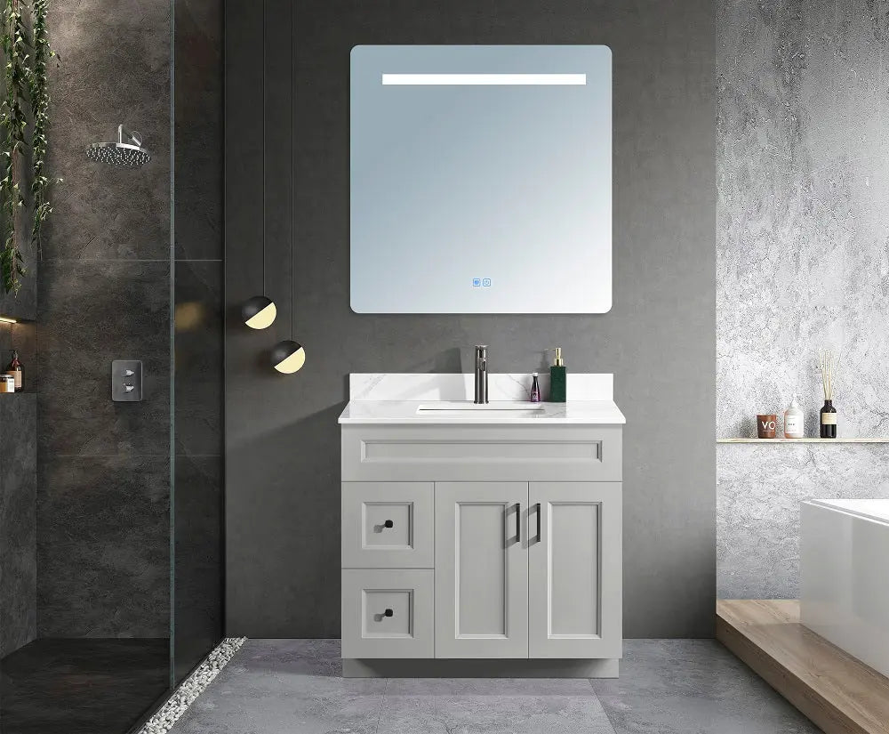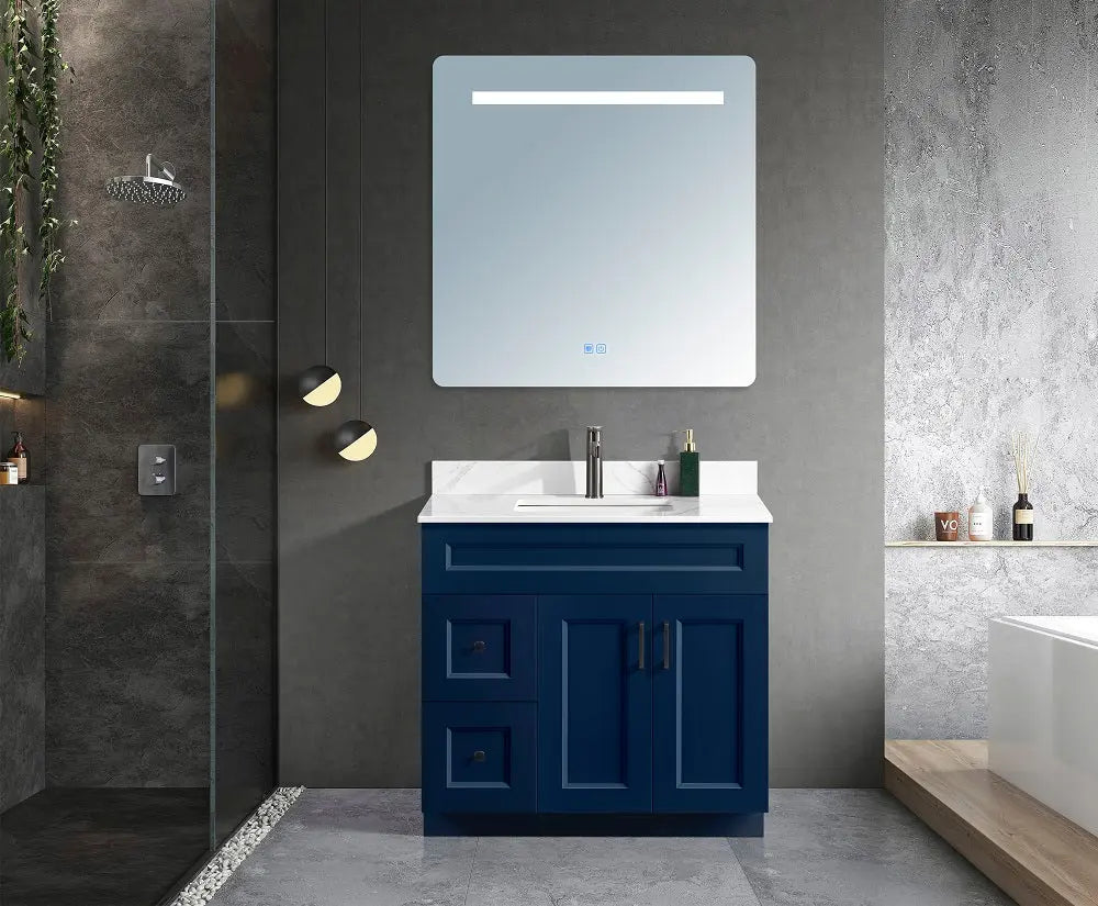 Introducing our meticulously crafted Beveled Edge Shaker-style bathroom vanity, featuring Grade A solid 3/4" MDF construction. This all-inclusive package includes a Vanity base, Quartz countertop with your choice of 1 hole or 3 hole options for faucet installation, along with an under mount sink, side splashes and Handles. handles are available in chrome, brushed nickel, matte black, or brushed gold finishes. Select from Carrera Quartz, Aria Quartz, or Pure White Quartz for the countertop. Elevate your bathroom effortlessly with timeless elegance and unmatched functionality with the Cleo Hampton Bathroom Vanity.