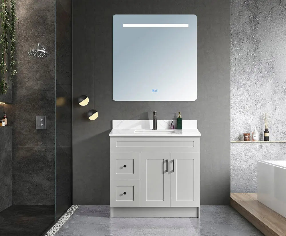 Introducing our meticulously crafted Beveled Edge Shaker-style bathroom vanity, featuring Grade A solid 3/4" MDF construction and solid wood Dovetail drawers. This all-inclusive package includes a Vanity base, Quartz countertop with your choice of 1 hole or 3 hole options for faucet installation, along with an under mount sink, side splashes and Handles. handles are available in chrome, brushed nickel, matte black, or brushed gold finishes. Select from Carrera Quartz, Aria Quartz, or Pure White Quartz for the countertop. Elevate your bathroom effortlessly with timeless elegance and unmatched functionality with the Cleo Hampton Bathroom Vanity.