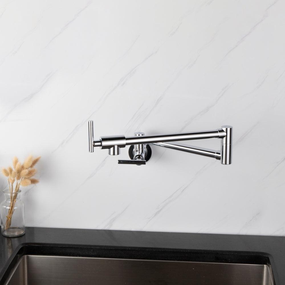 Cleo Sleek Wall Mount Kitchen Pot Filler Elevate your kitchen with the Cleo Sleek Wall Mount Kitchen Pot Filler – a marriage of elegance and functionality. Crafted from solid lead-free brass, this pot filler ensures durability and reliability for your culinary adventures.