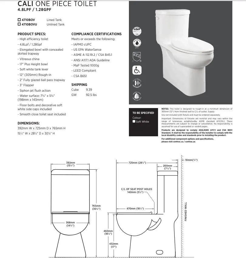 Contrac Wilton Elongated 3.0 LPF One Piece Toilet White Unlined Tank
