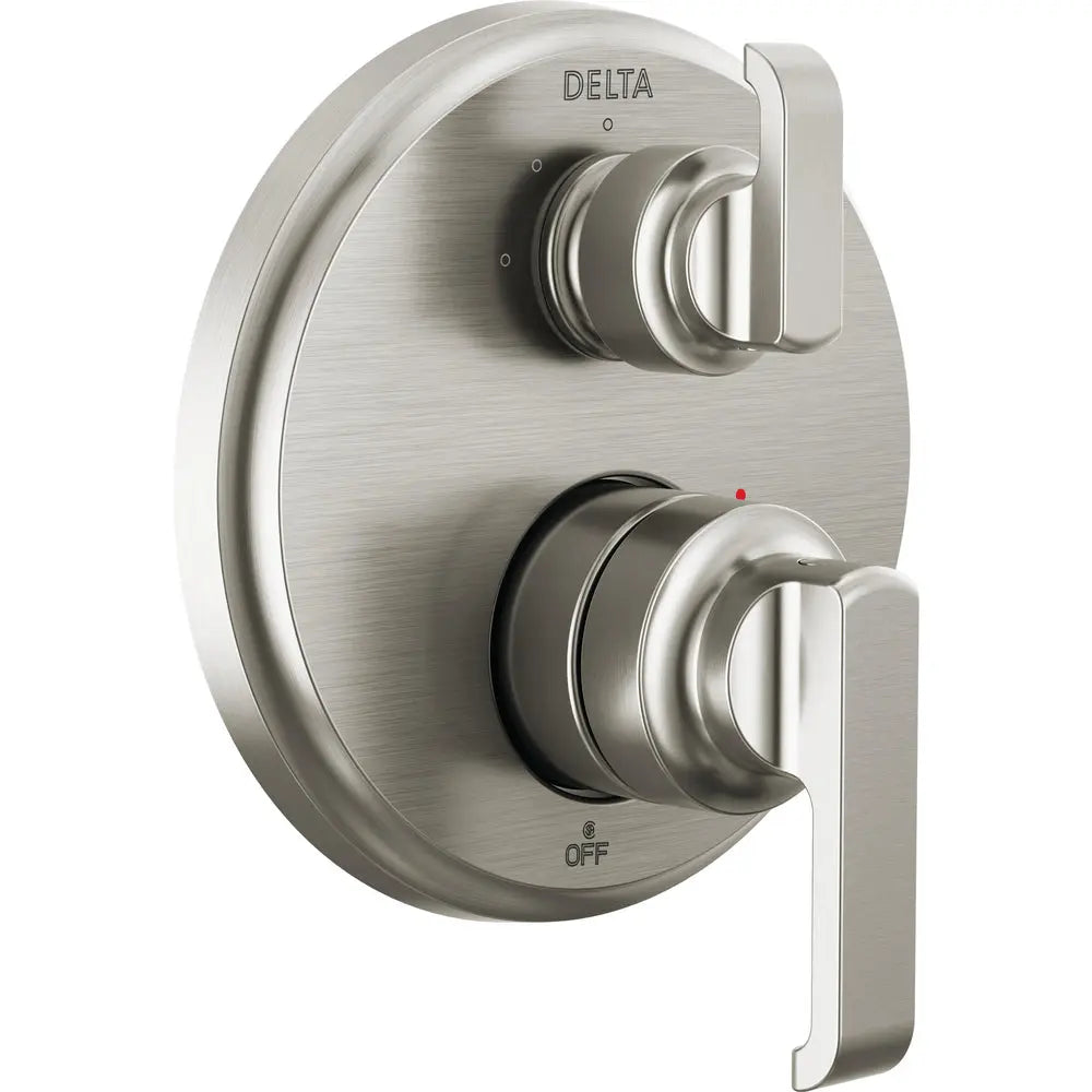Familiar geometries and subtle curves in the Tetra Bath Collection combine to bring a sleek, architectural look and feel to the bath. Familiar geometries and subtle curves in the Tetra Bath Collection combine to bring a sleek, architectural look and feel to the bath. Delta showers with Monitor pressure-balance valves are engineered to make sure you don't experience a sudden and possibly unsafe change in water temperature as a result of running water elsewhere, such as using a dishwasher, flushing a toilet or running a washing machine. Delta Lumicoat Finishes are guaranteed to resist water spots and mineral buildup and easily wipe clean without the need for cleaners or chemicals. The ultra-sleek surface repels liquids, resisting water spots and staying cleaner longer, so your faucet's most commonly touched areas stay beautiful. By integrating separate controls on one trim with the MultiChoice Integrated Shower Diverter, we've streamlined installation and your shower style. You can install with confidence, knowing Delta products are backed by our Lifetime Limited Warranty.