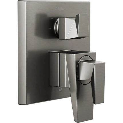 The prismatic faceting of the Trillian Bath Collection is an evolution of modern style that creates an edgy look which catches the light as well as the eye. Delta showers with Monitor pressure-balance valves are engineered to make sure you don't experience a sudden and possibly unsafe change in water temperature as a result of running water elsewhere, such as using a dishwasher, flushing a toilet or running a washing machine. By integrating separate controls on one trim with the MultiChoice Integrated Shower Diverter, we've streamlined installation and your shower style. With the MultiChoice Universal system, you have the freedom to upgrade style and functionality later. And, because there's no need to alter plumbing behind the wall, you save time, effort and money on future renovation updates. With separate volume and temperature control on this model, simply set the water at your preferred temperature and turn the shower on or off with the volume control handle ' without interrupting your set temperature. You can install with confidence, knowing that Delta showers are backed by our Lifetime Limited Warranty.