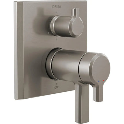 The confident slant of the Pivotal Bath Collection makes it a striking addition to a bathroom's contemporary geometry for a look that makes a statement. Delta showers with TempAssure thermostatic valves are engineered to make sure you don't experience a sudden and possibly unsafe change in water temperature as a result of running water elsewhere, such as using a dishwasher, flushing a toilet or running a washing machine. By integrating separate controls on one trim with the MultiChoice Integrated Shower Diverter, we've streamlined installation and your shower style. With the MultiChoice Universal system, you have the freedom to upgrade style and functionality later. And, because there's no need to alter plumbing behind the wall, you save time, effort and money on future renovation updates. With separate volume and temperature control on this model, simply set the water at your preferred temperature and turn the shower on or off with the volume control handle ' without interrupting your set temperature. You can install with confidence, knowing that Delta showers are backed by our Lifetime Limited Warranty.