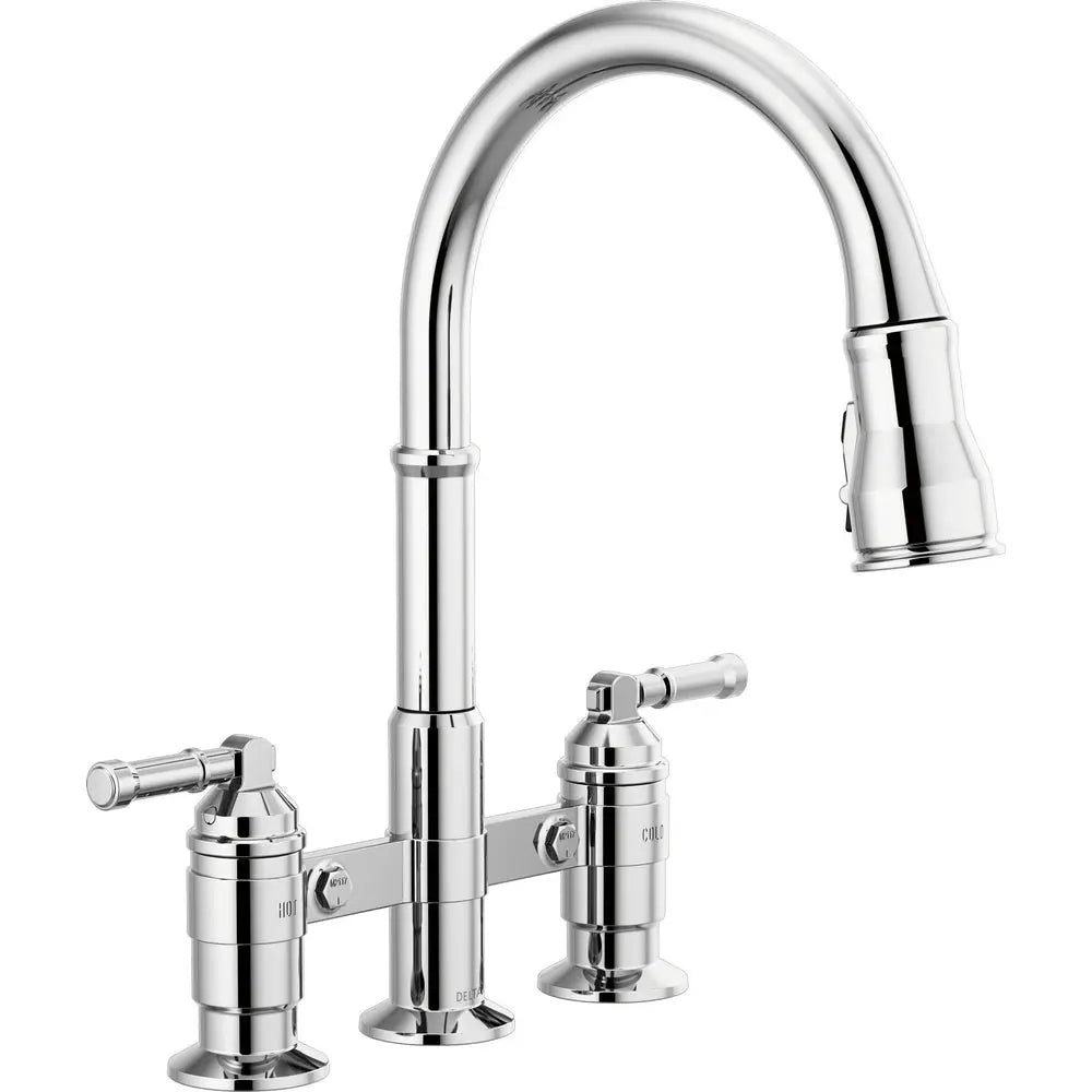 The powerful features of the Broderick Collection take center stage in the kitchen, with an industrial style that alludes to a rich heritage. The collection includes distinctive bridge faucet and pull-down spring spout faucet options that add a unique element to any kitchen. Styled after the rugged nuts and bolts of machinery, it serves as a true centerpiece in the kitchen. Kitchen sink faucets with Touch-Clean Spray Holes allow you to easily wipe away calcium and lime build-up with the touch of a finger. Delta ShieldSpray Technology cleans with laser-like precision while containing mess and splatter. A concentrated jet powers away stubborn messes while an innovative shield of water contains splatter and clears off the mess, so you can spend less time soaking, scrubbing and shirt swapping. Delta kitchen faucets with DIAMOND Seal Technology perform like new for life with a patented design which reduces leak points, is less hassle to install and lasts twice as long as the industry standard*. Kitchen sink faucets with Touch-Clean Spray Holes allow you to easily wipe away calcium and lime build-up with the touch of a finger. You can install with confidence, knowing that Delta kitchen faucets are backed by our Lifetime Limited Warranty. *Industry standard is based on ASME A112.18.1 of 500,000 cycles.