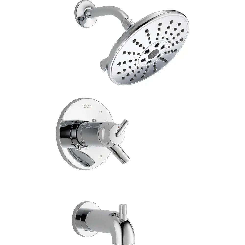 Delta H2Okinetic Showers look different because they are different. Using advanced technology, H2Okinetic showers sculpt water into a unique wave pattern, giving you 3X the coverage of a standard shower head.* The end result is a shower that provides more coverage, more warmth and more intensity for a truly drenching shower experience. With separate handles for volume and temperature control, this Delta tub/shower provides a more refined showering experience. Simply set the water at your preferred temperature and turn the shower on or off with the volume control handle - without interrupting your set temperature. The pause setting gives you ample space for shaving, lathering and other shower tasks, then easily restarts the water with the temperature where you left off. This spray setting helps you conserve water, so you can worry less about depleting your supply of hot water - and you help the environment too. Delta thermostatic valves use TempAssure Technology to protect you and your family from sudden temperature changes. Chrome has rapidly become one of the most popular finishes across décor styles in the bath thanks to its stunning gloss and innate versatility. Paired with crisp lines and bright whites, it creates a bold, modern contrast, but it works equally well with vintage styles and traditional spaces to convey a hint of nostalgia. Delta WaterSense labeled faucets, showers and toilets use at least 20% less water than the industry standard'saving you money without compromising performance.