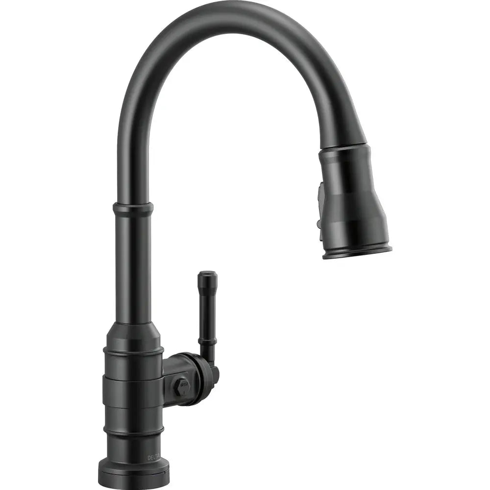 The powerful features of the Broderick Collection take center stage in the kitchen, with an industrial style that alludes to a rich heritage. The collection includes distinctive bridge faucet and pull-down spring spout faucet options that add a unique element to any kitchen. Styled after the rugged nuts and bolts of machinery, it serves as a true centerpiece in the kitchen. Touch it on. Touch it off. Whether you have two full hands or 10 messy fingers, Delta Touch2O Technology helps keep your kitchen faucet clean, even when your hands aren't. A simple touch anywhere on the spout or handle with your wrist or forearm activates the flow of water at the temperature where your handle is set. The Delta TempSense LED light changes color to alert you to the water's temperature and eliminates any possible surprises or discomfort. Kitchen sink faucets with Touch-Clean Spray Holes allow you to easily wipe away calcium and lime build-up with the touch of a finger. Delta ShieldSpray Technology cleans with laser-like precision while containing mess and splatter. A concentrated jet powers away stubborn messes while an innovative shield of water contains splatter and clears off the mess, so you can spend less time soaking, scrubbing and shirt swapping. Delta kitchen faucets with Diamond Seal Technology perform like new for life with a patented design which reduces leak points, is less hassle to install and lasts twice as long as the industry standard*. Kitchen sink faucets with Touch-Clean Spray Holes allow you to easily wipe away calcium and lime build-up with the touch of a finger. You can install with confidence, knowing that Delta kitchen faucets are backed by our Lifetime Limited Warranty. Electronic parts are backed by our 5-year electronic parts warranty. *Industry standard is based on ASME A112.18.1 of 500,000 cycles.