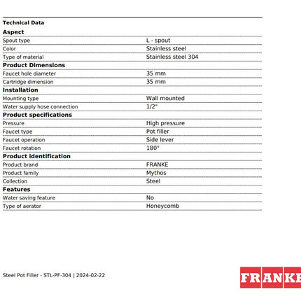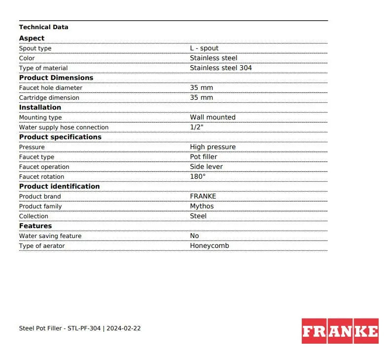 Franke 304 Two Handle Stainless Steel Wall Mounted Pot Filler