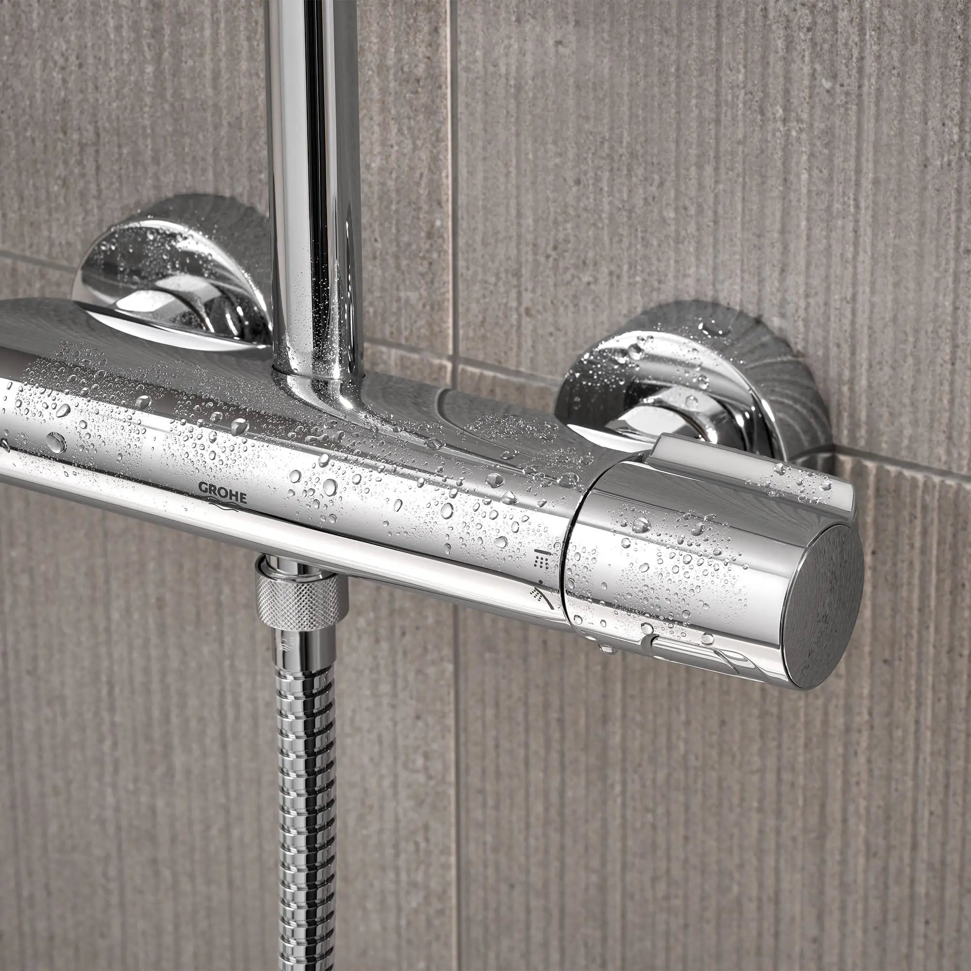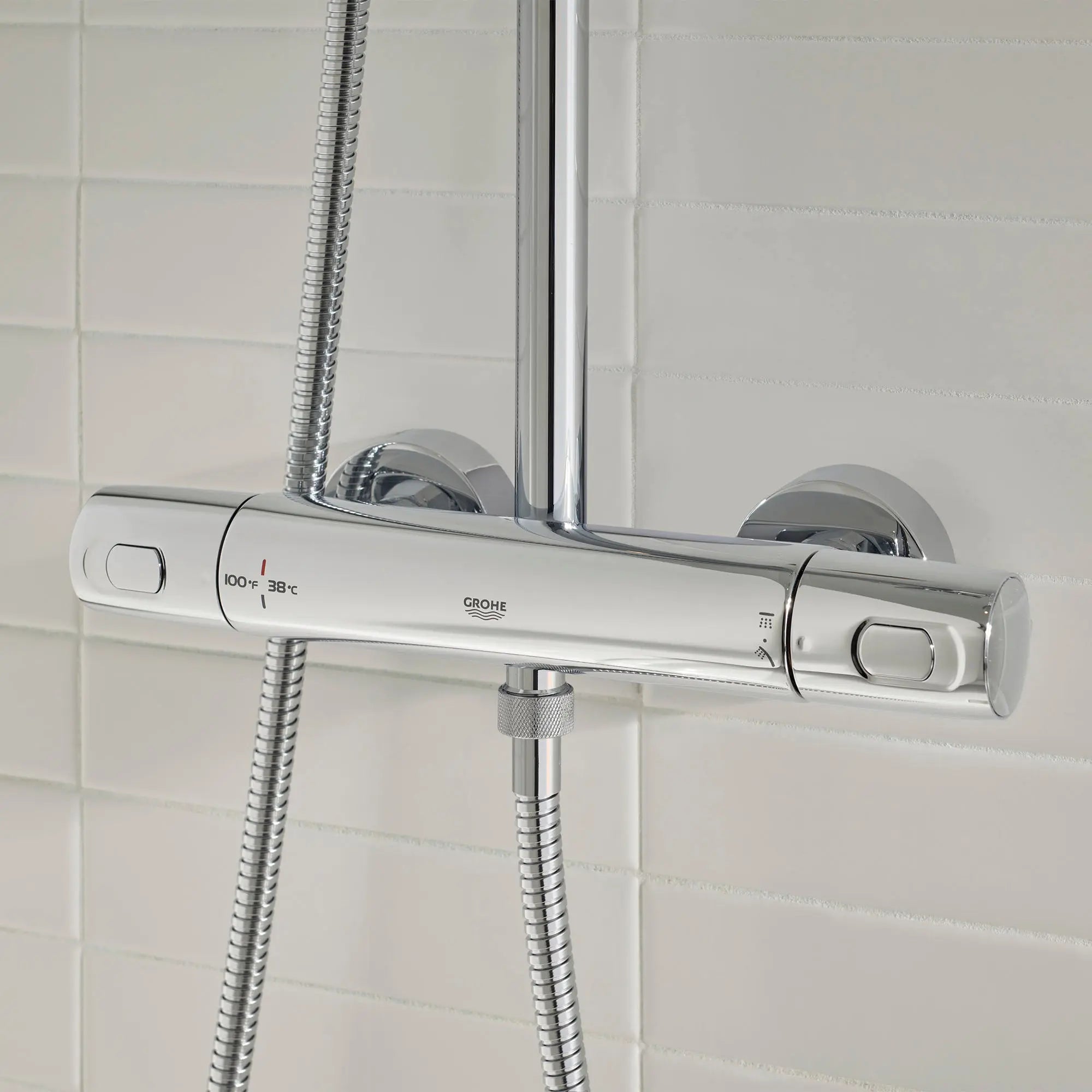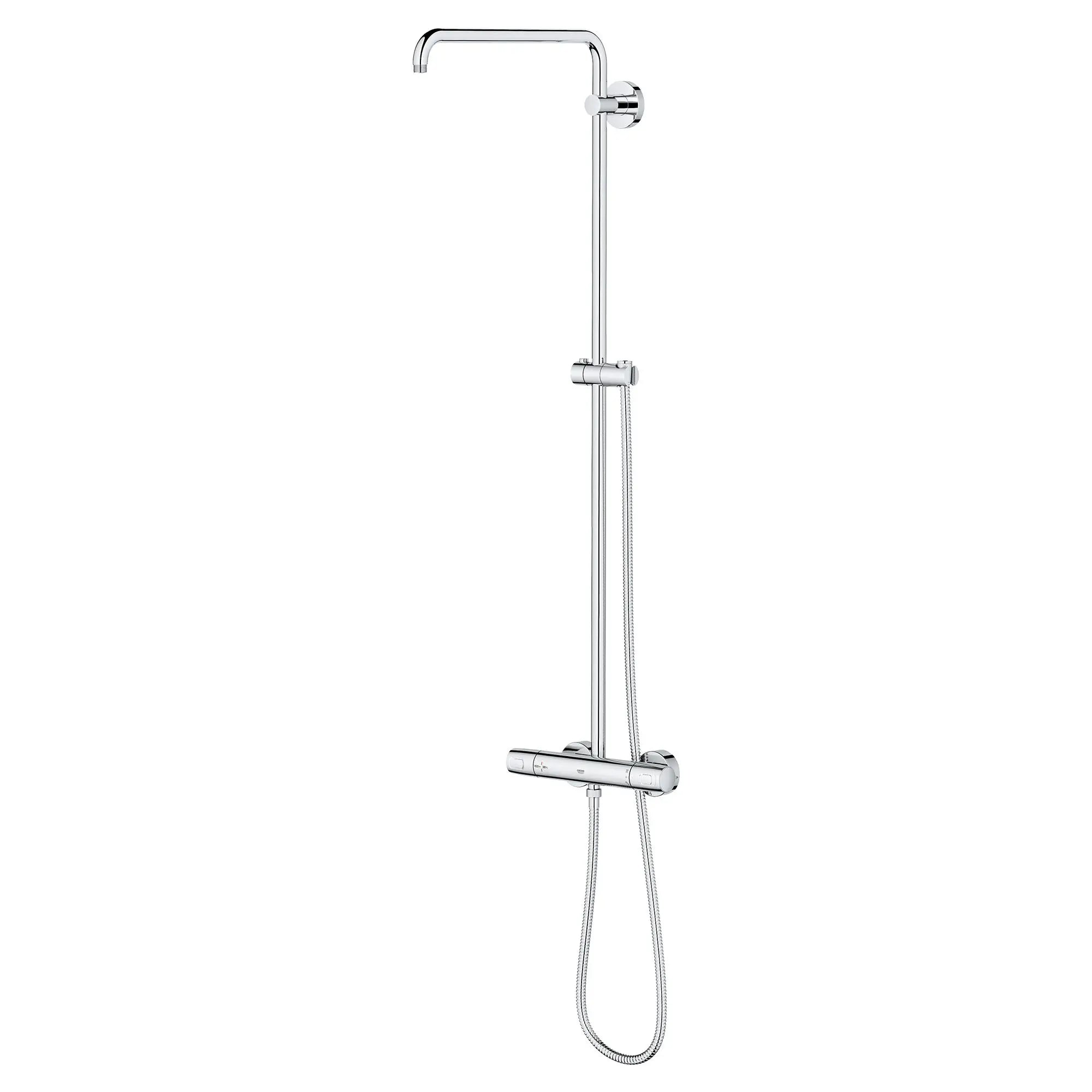 - System includes GROHE CoolTouch thermostatic control, shower arm, shower bar with adjustable height hand shower holder and metal hose; shower head and hand shower are sold separately