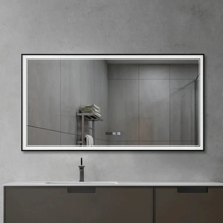 Upgrade your space with this sleek front-lit framed LED mirror, designed for both style and functionality. Equipped with a built-in time and date display, it keeps you on schedule while enhancing your daily routine. The power-off memory function remembers your last settings, so your lighting is always just the way you like it.