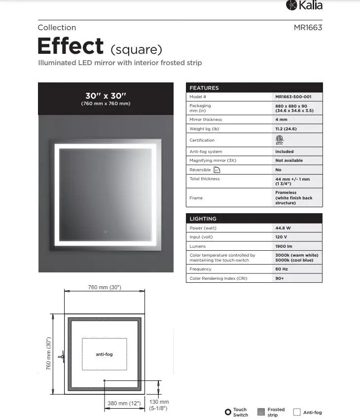 Kalia EFFECT 30 Inch Square LED Mirror With Interior Frosted Strip