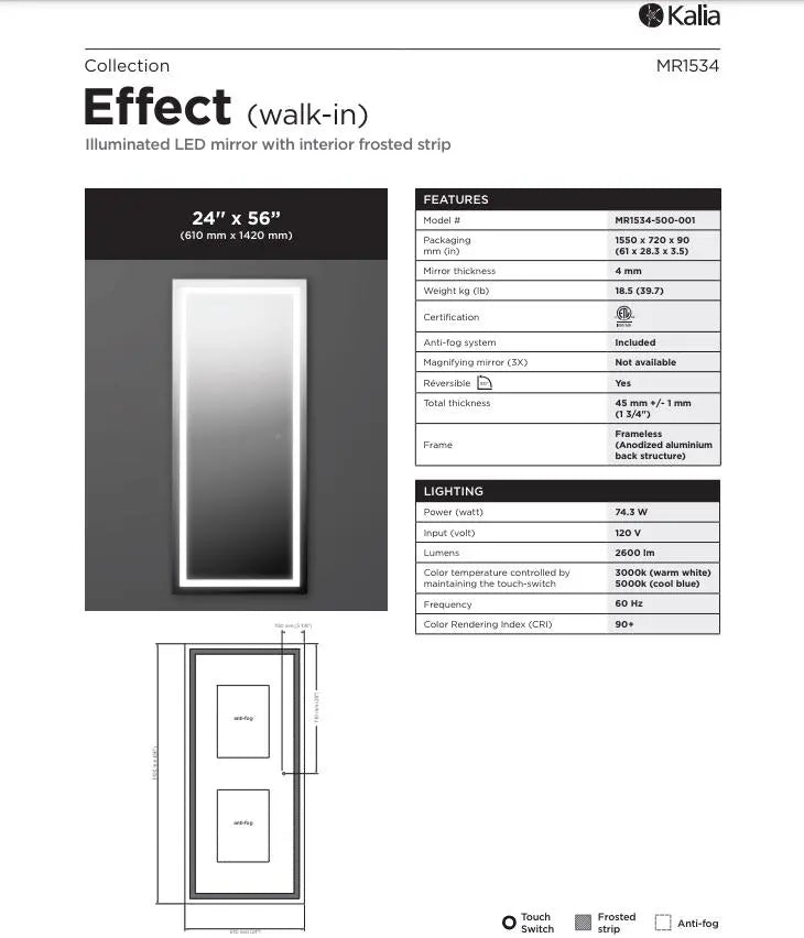 Kalia EFFECT Full Frame 24" x 56" LED Mirror With Frosted Strip Inside
