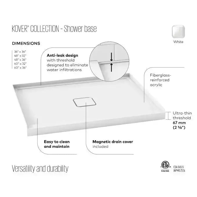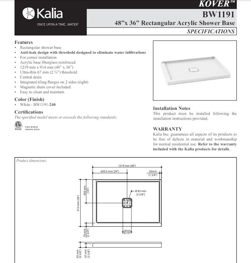 Kalia Kover 48x36 Rectangular Acrylic Shower Base Right Tile Flange