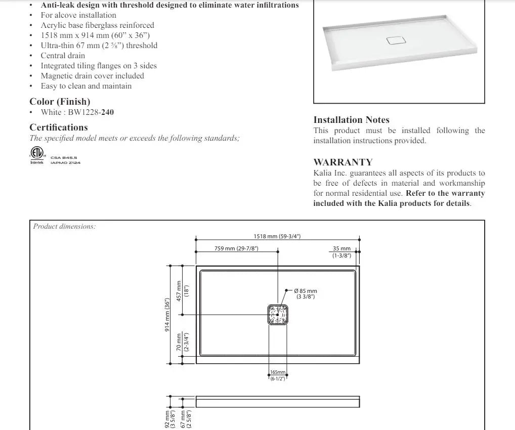 Kalia Kover 60x36 Rectangular Shower Base Central Drain With Flange