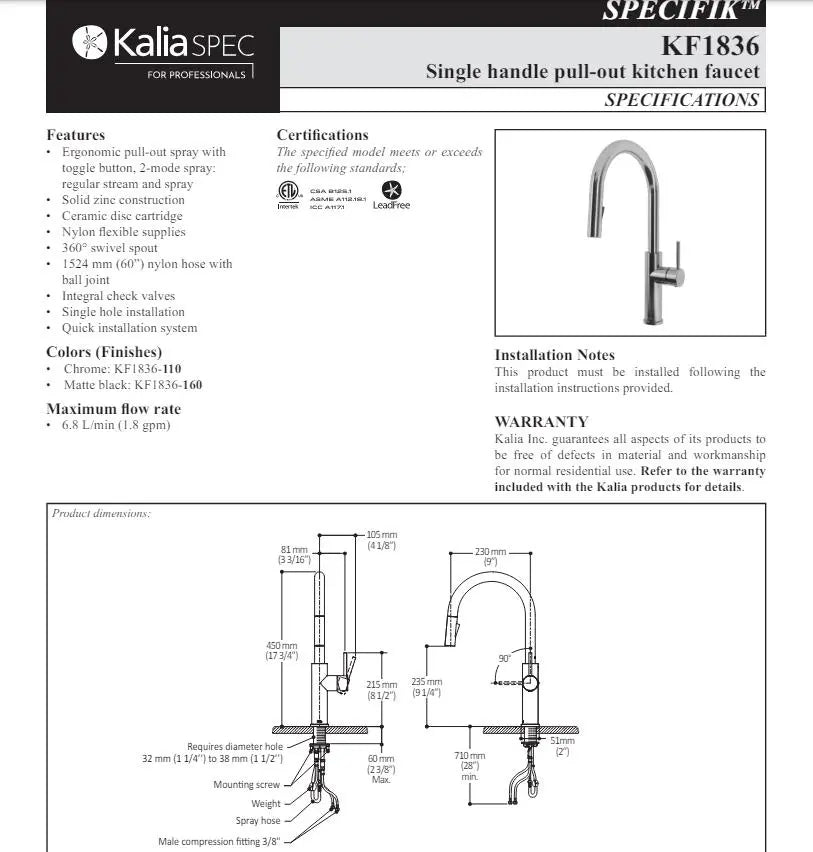 Transform your kitchen with the Kalia Specifik Single Handle Pull Down Kitchen Faucet. Built with durable zinc construction, this faucet features a ceramic disc cartridge for reliable performance. The ergonomic pull-out spray offers a toggle button for easy switching between regular stream and spray modes. With 9.5 mm (3/8”) stainless steel braided flexible supplies and a 360° swivel spout, it ensures versatility and ease of use. The 1524 mm (60”) nylon hose with a ball joint and integral check valves add to its functionality. Designed for single hole installation, the quick installation system makes setup a breeze. Elevate your kitchen experience with this stylish and practical faucet.