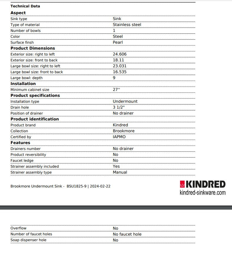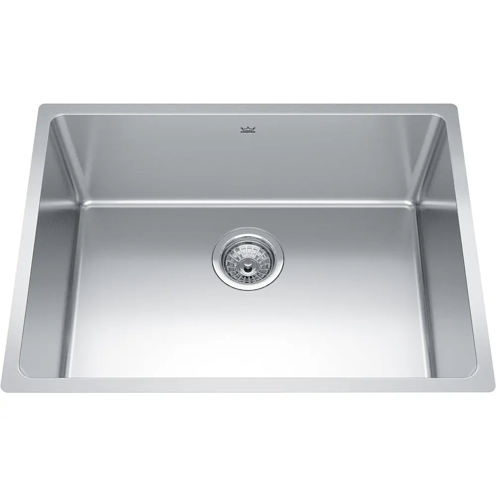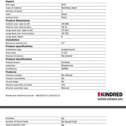 Kindred Brookmore 24.62" x 18.12" Undermount Single Bowl Stainless Steel Kitchen Sink BSU1825-9 Brookmore Collection 24.7-in x 18.2-in Undermount Single Bowl Stainless Steel Kitchen Sink. The Brookmore stainless steel sink collection will create something truly unique that fits both prepping and cleaning needs. Made with high-quality 18-gauge stainless steel with a rich chromium content that helps shield the material from corrosion and prevents bacterial growth. The undermount sink style provides a sleek, modern look and makes cleaning up spills and messes easy. The spacious 9" deep bowl is perfect for soaking and washing stacks of dishes, and the sound-dampening system goes to work to reduce the noise caused by a garbage disposal or running water.
