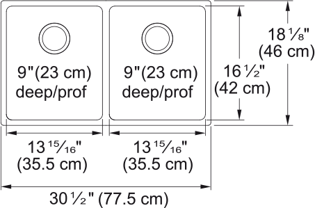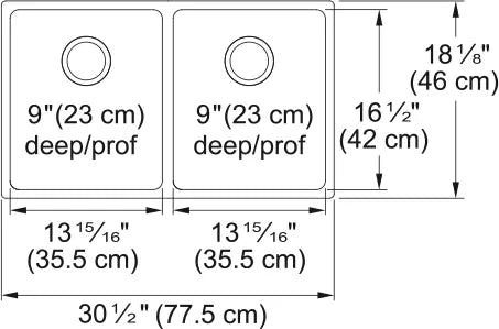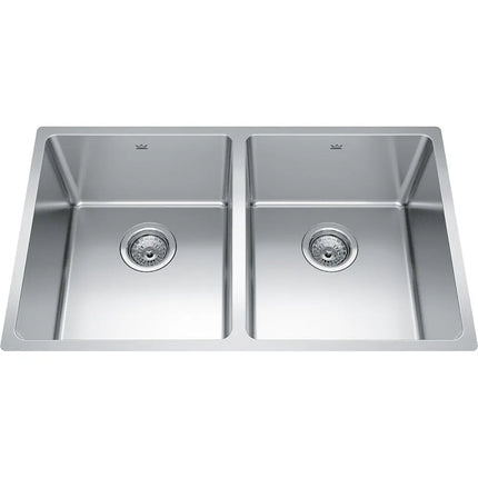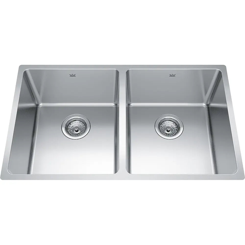 Kindred Brookmore 30.5" x 18.12" Drop-In Undermount Kitchen Sink 2 Bowls Stainless Steel BDU1831-9 Brookmore Collection 12.1-in x 18.2-in Undermount Double Bowl Stainless Steel Kitchen Sink. The Brookmore stainless steel sink collection will create something truly unique that fits both prepping and cleaning needs. Made with high-quality 18-gauge stainless steel with a rich chromium content that helps shield the material from corrosion and prevents bacterial growth. The undermount sink style provides a sleek, modern look and makes cleaning up spills and messes easy. The spacious 9" deep bowls are perfect for soaking and washing stacks of dishes, and the sound-dampening system goes to work to reduce the noise caused by a garbage disposal or running water.