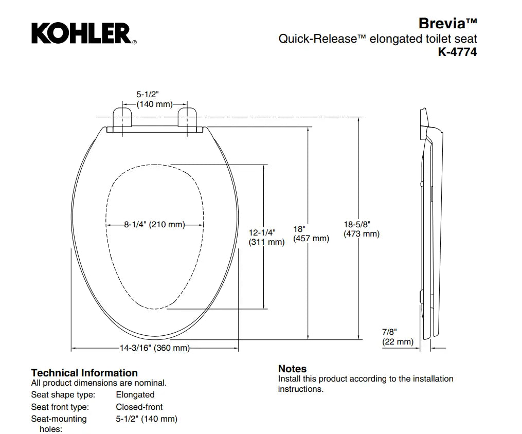 Kohler Brevia Quick-Release Elongated Toilet Seat 4774-0