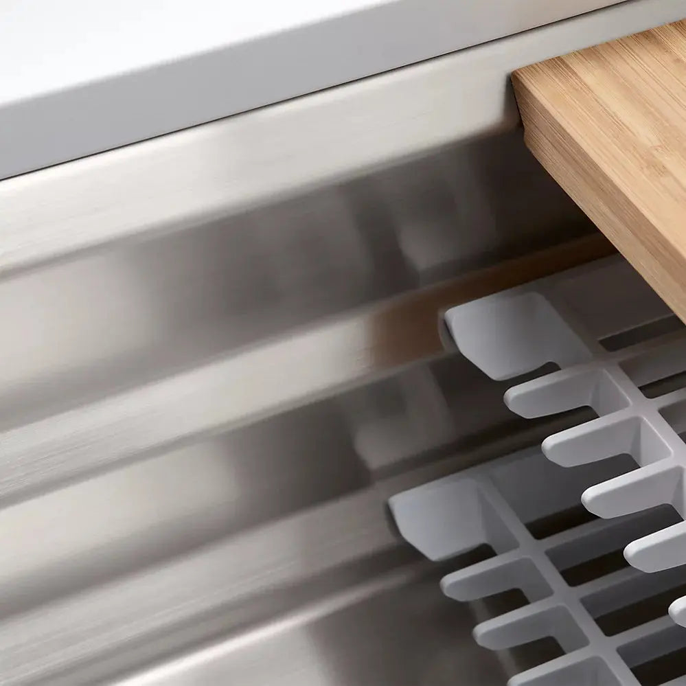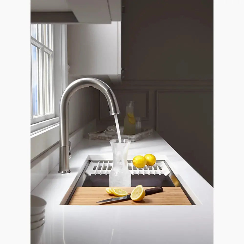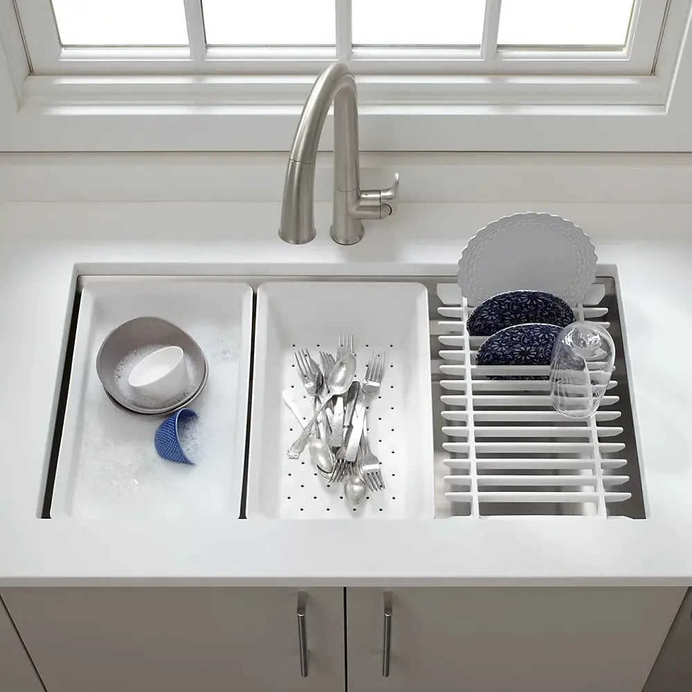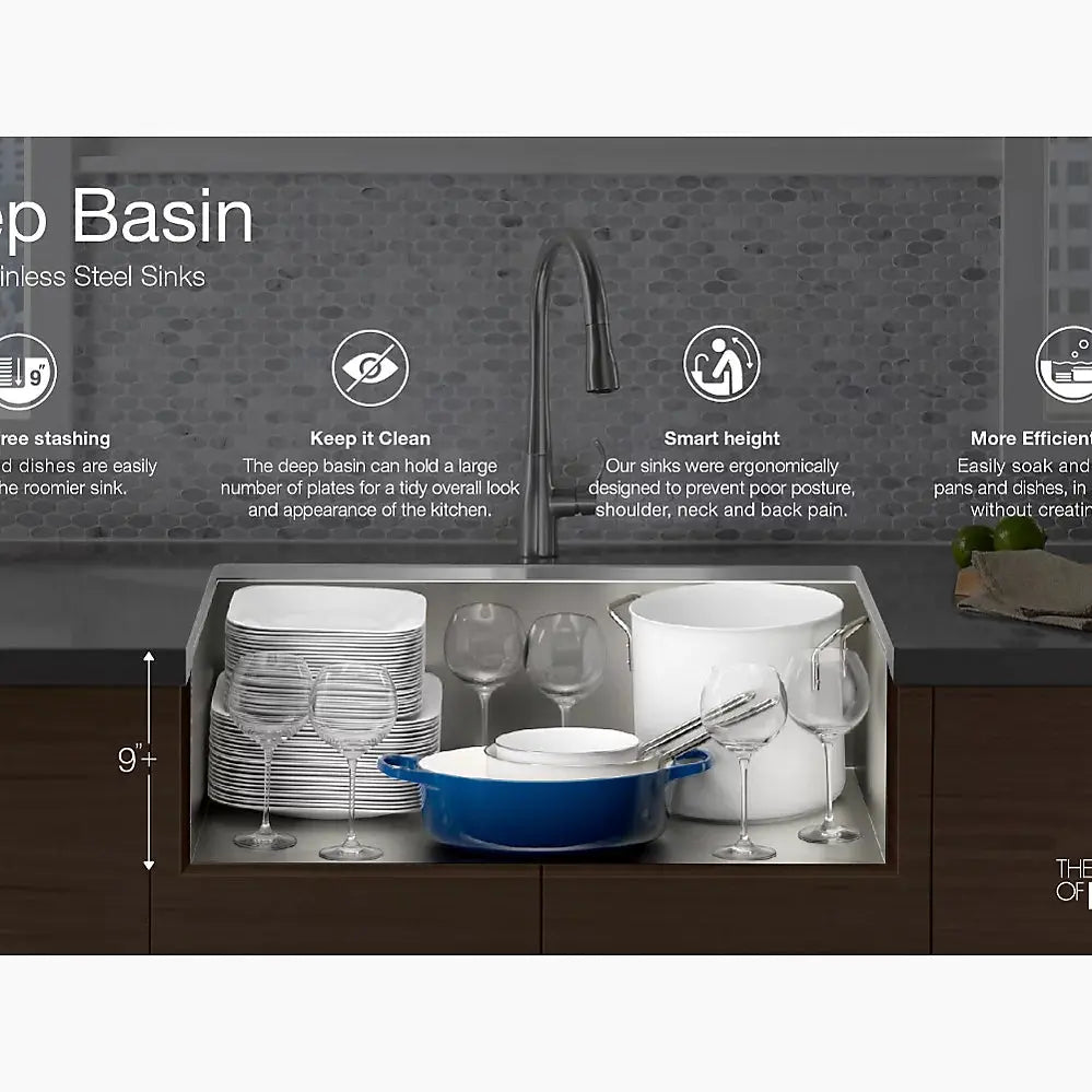 Create a highly functional kitchen workstation with the KOHLER® Prolific sink and its included accessories. This innovative stainless-steel undermount kitchen sink features three graduated ledges in the basin, so you can place the bamboo cutting board, multipurpose grated racks (two), colander, and wash bin exactly where you want them for maximum efficiency as you work. The sink comes with all five accessories included. Other features include a unique cone-shaped drain for easier cleanup and SilentShield sound absorption for less noise.