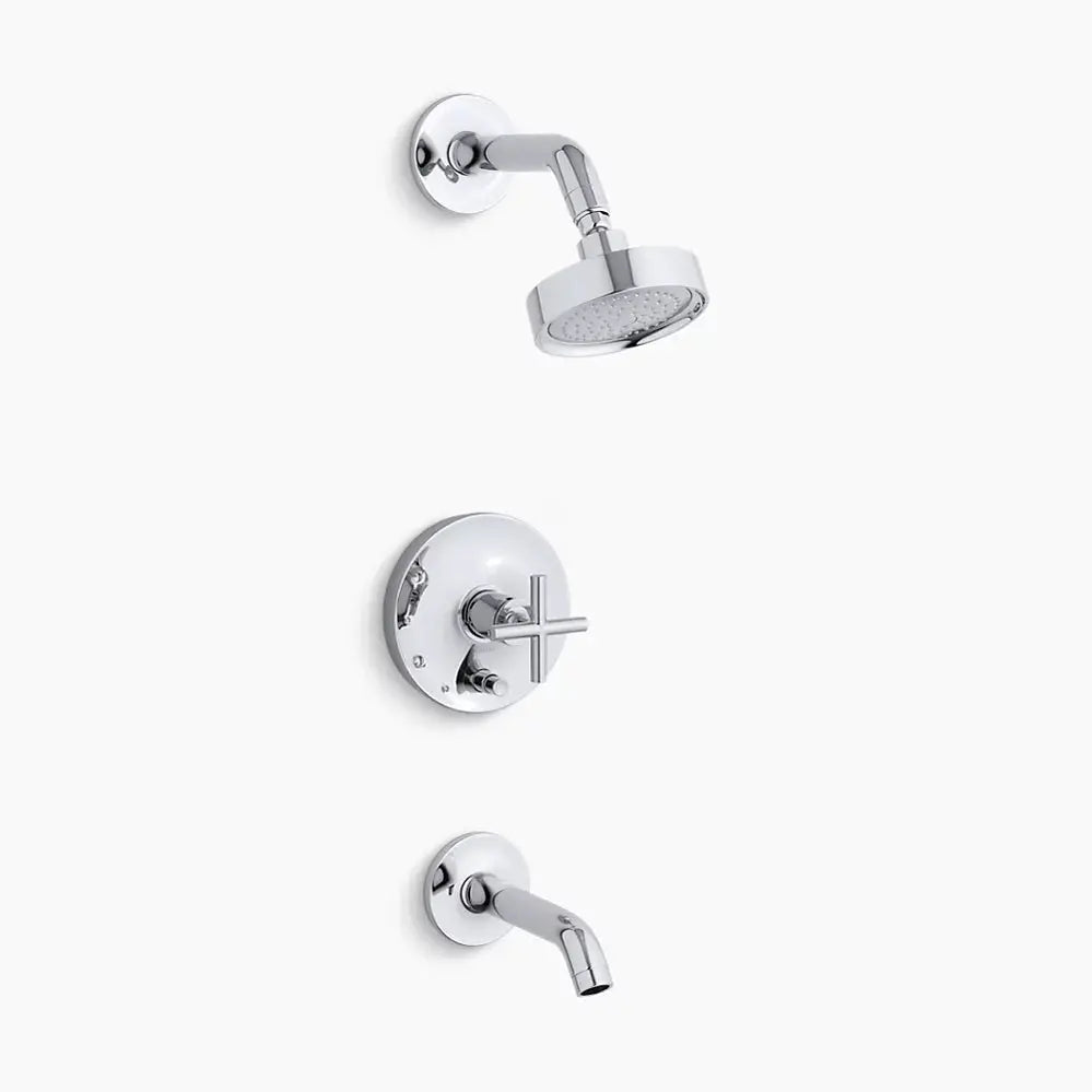 Purist® faucets and accessories combine simple, architectural forms with sensual design lines. Featuring this modern, minimalist style, the Purist® bath and shower valve trim creates a sophisticated, unified look in your shower with a cross handle, spout and showerhead. Pair this trim with a Rite-Temp® pressure-balancing valve with push-button diverter, which maintains your desired water temperature during pressure fluctuations.
