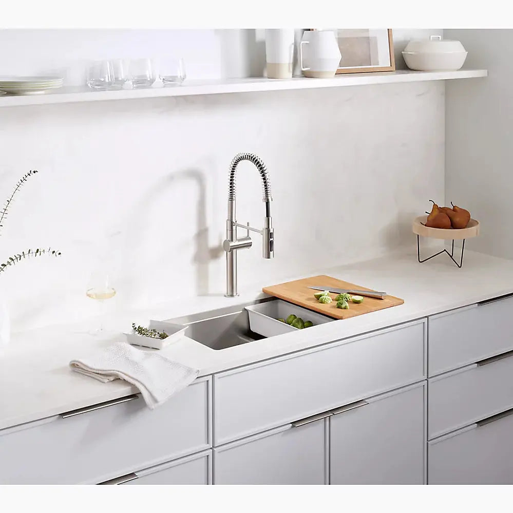 Imagine a smart divide® 33" top-/undermount double-bowl workstation kitchen sink kitchen sink with customized accessories that work with it so it works for you. Welcome to the KOHLER® Task workstation sink. Complete functionality packaged within a contemporary stainless steel design, the Task workstation sink makes food prep easier, with a two-piece nesting colander set and durable bamboo cutting board that each slide effortlessly within the sink to tailor your workstation for the task at hand. The dishwasher-safe silicone sink mats help protect both your sink and fragile dishes from damage. This workstation sink gives the word “task” a whole new meaning.