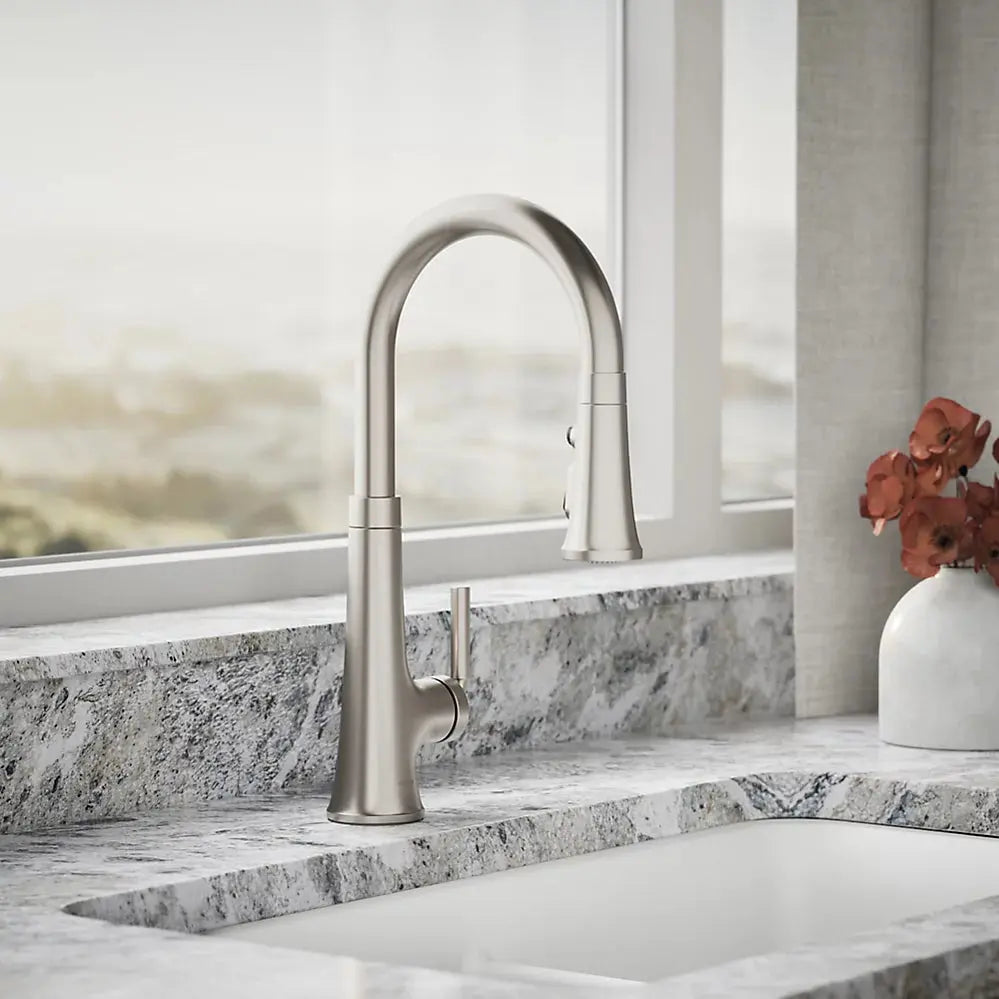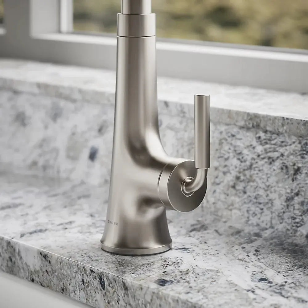 With clean lines and a soft teardrop base, the KOHLER® Tone kitchen faucet collection features a fresh take on mid-century modern style. This inviting pull-down deck-mount kitchen sink faucet design, where minimalism meets warmth, makes for a perfect fit in any space. Paired with thoughtful functionality, the Tone collection is a dynamic beauty.