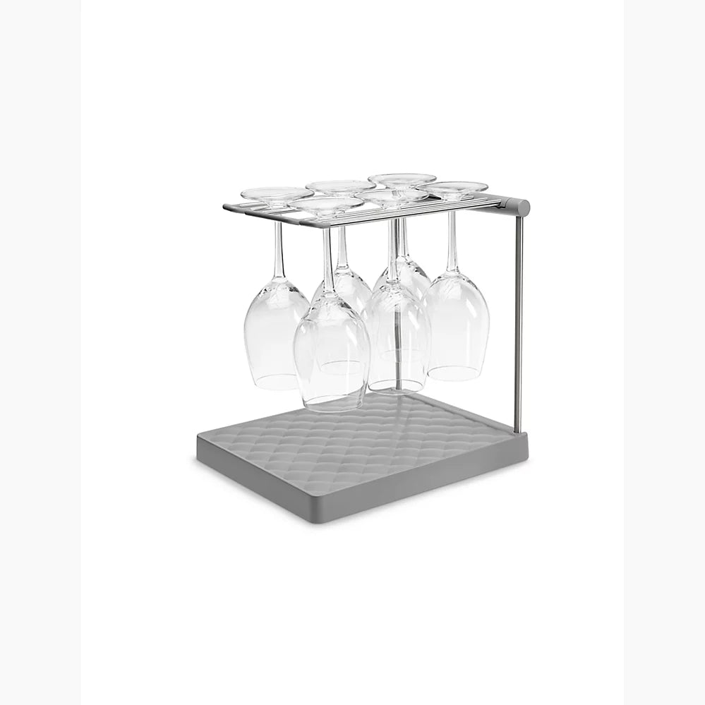 This wine glass drying rack holds glasses upside-down to increase air circulation and reduce water spots on the glass. It accommodates wine glasses of various shapes, sizes, and heights and folds away for storage when not in use.
