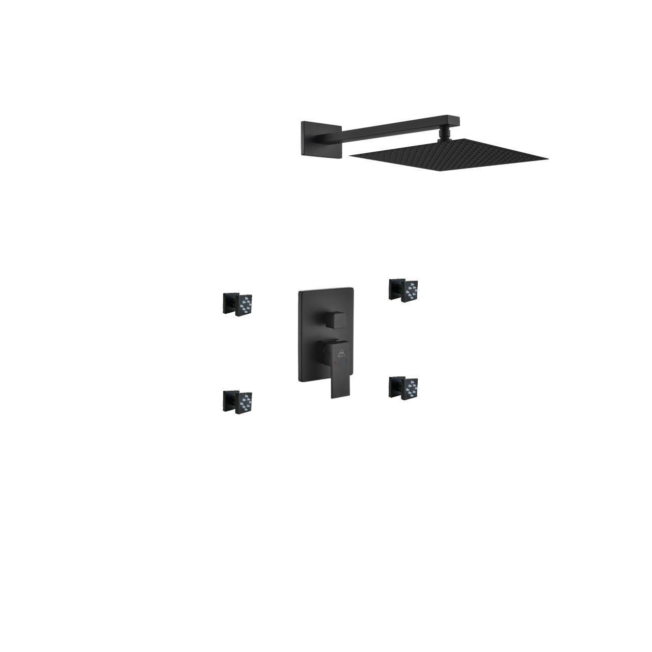 AQUA PIAZZA 12″ RAIN SHOWER HEAD W/ FOUR BODY JETS – MATTE BLACK FINISH