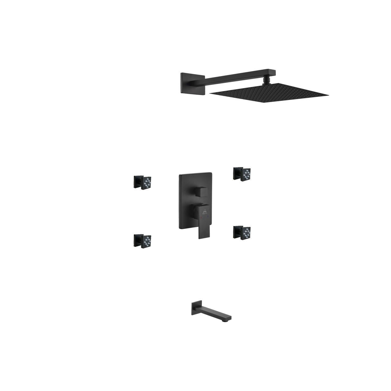 AQUA PIAZZA 12″ RAIN SHOWER HEAD W/TUB FILLER & MASSAGE BODY JETS – MATTE BLACK FINISH