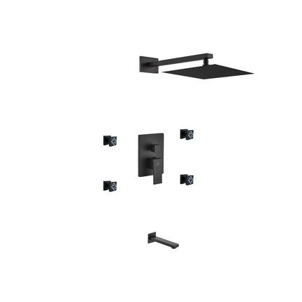Kube Bath Aqua Piazza Black Shower Set With 12" Square Rain Shower, Tub Filler and 4 Body Jets