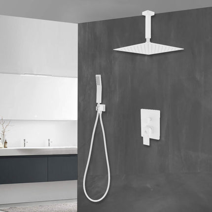 Kube Bath Aqua Piazza White Shower Set W/ 12″ Ceiling Mount Square Rain Shower and Handheld
