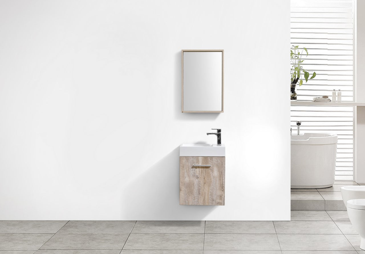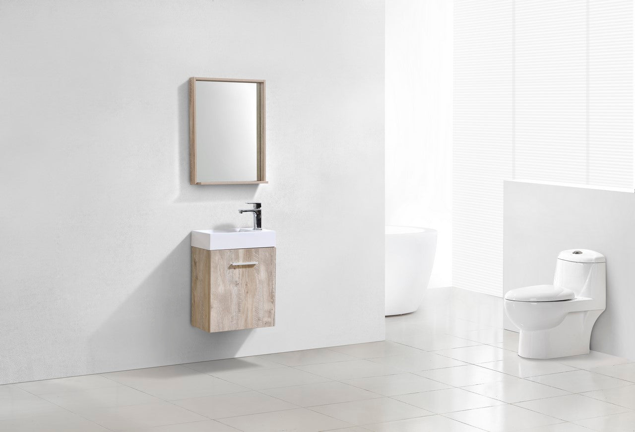Kube Bath Bliss 18″ Nature Wood Wall Mount Modern Bathroom Vanity Innovative design and economical in size makes this vanity ideal for any smaller location. Available in various finishes ensures that regardless the color scheme at hand, anyone is sure to complete their space with guaranteed cutting contemporary chicness.