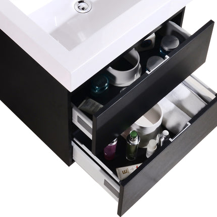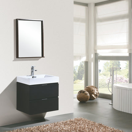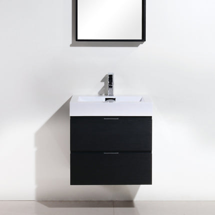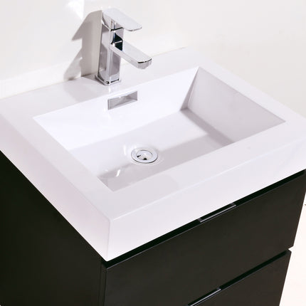 Kube Bath Bliss 24″ Black Wall Mount Modern Bathroom Vanity The Bliss is one of the most elegant modern Bathroom Vanities around. This 24 Inch model comes with a reinforced Acrylic sink, Marine Wood Veneer Constructed Console that is fully moister and water proof, with high quality European Hardware, that provides smooth soft-closing operation drawers.