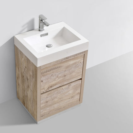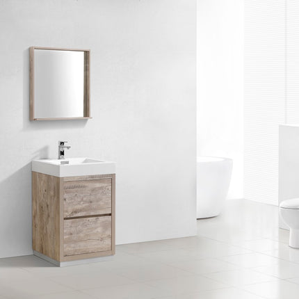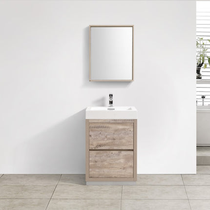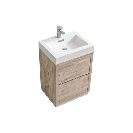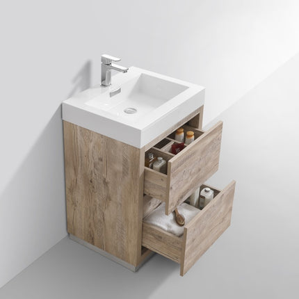 Kube Bath Bliss 24″ Nature Wood Floor Mount Modern Bathroom Vanity The Bliss is one of the most elegant modern Bathroom Vanities around. This 24 Inch model comes with a reinforced Acrylic sink, Marine Wood Veneer Constructed Console that is fully moister and water proof, with high quality European Hardware, that provides smooth push-open operation drawers.